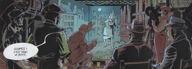 Frédéric Blier de son côté, s’est appliqué à maintenir un trait semi-réaliste avec des personnages ayant de véritables « gueules » pour bien caler à l’époque. Mais il nous dévoile également une autre facette de son talent à travers toutes les cases issues des projections cinématographiques en jouant sur les couleurs mais aussi sur le style.