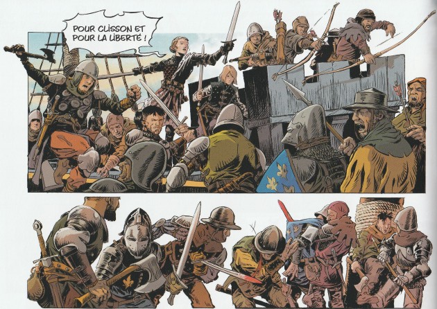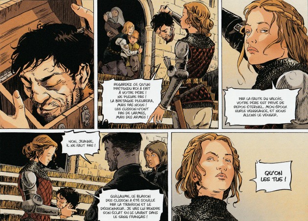 bretonne. Le scénariste alsacien ouvre cette biographie par un prolepse maritime ultra spectaculaire, une manière de ferrer le lecteur assez fréquente mais extrêmement efficace. Par la suite, on retrouve le fil de l’histoire. Quelques mois plus tôt, Olivier de Clisson est tombé dans un traquenard tendu par le roi de France Philippe VI. En effet, le monarque souhaite mettre au pas une Bretagne frondeuse. Pour ce faire, il va se servir d’une lettre dans laquelle Jeanne de Belleville, l’épouse, évoque une tentative d’évasion. Condamné à mort, Olivier de Clisson est exécuté et sa tête est envoyée à sa veuve. Cette partie de l’exposition se déroule sans accroc : cela laisse largement le temps aux lecteurs pour se familiariser avec les principaux protagonistes. Ivre de chagrin et de colère, Jeanne décide de se venger et déclare la guerre à Philippe VI. Pour le lecteur, c’est un sacré changement de rythme. Les attaques de forteresse se succèdent à celles des bateaux à un rythme soutenu avec un seul et unique mot d’ordre : pas de quartier ! Cette partie occupe la majeure partie de l’album et elle montre bien l’aveuglement de Jeanne ainsi que son jusque boutisme. Pour mettre en image cette biographie à grand spectacle, il faut un dessinateur qui aime les jeux d’acteurs : Frédéric Blier. Celui qui s’est fait connaître grâce à