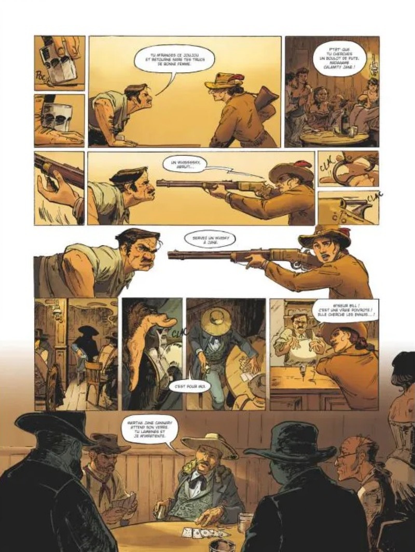 Dans une plaine du Wyoming en 1873, les Tuniques bleues ont comme éclaireur une femme, ce qui n’est pas du goût du capitaine Egan. Pourtant lorsque la compagnie se fera surprendre par les indiens et que cette jeune femme lui sauvera la vie, son opinion va totalement changer. Enfin, c’est ce que l’on raconte comme histoire dans les illustrés contant la vie de Calamity Jane. Ainsi lorsqu’elle débarque en 1876 à Deadwood, sa réputation n’est plus à faire et en échange de quelques verres, elle vous promet de vous livrer la suite de ses aventures. Mais ceci n’est pas du goût du barman qui commence à sentir que l’agitation grandit autour de la jeune femme. Il refuse de la servir, elle le braque avec son fusil, il faudra l’intervention de Wild Bill Hickok himself pour que tout rentre dans l’ordre. Mais l’histoire ne s’arrête pas là. Après avoir picolé quelques bouteilles, Calamity Jane part cuver sous son chariot. C’est alors que le rancunier barman va tenter d’abuser d’elle mais une nouvelle fois, Calamity Jane va être sauvée par la tenancière du bordel d’en face, Dora Ducan qui va la prendre sous son aile et lui proposer un poste de cuisinière dans son établissement.