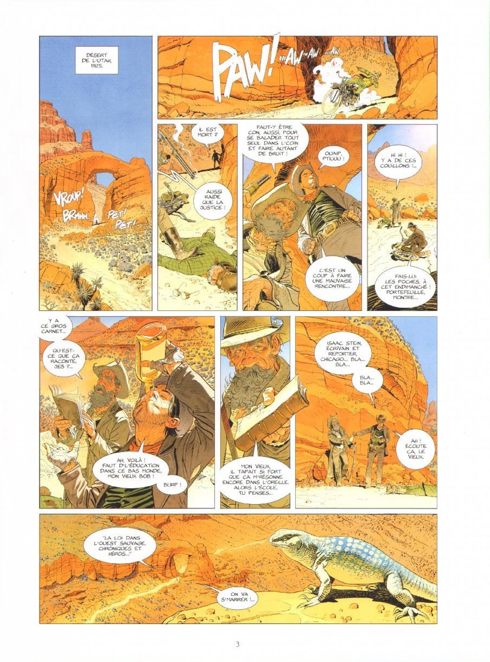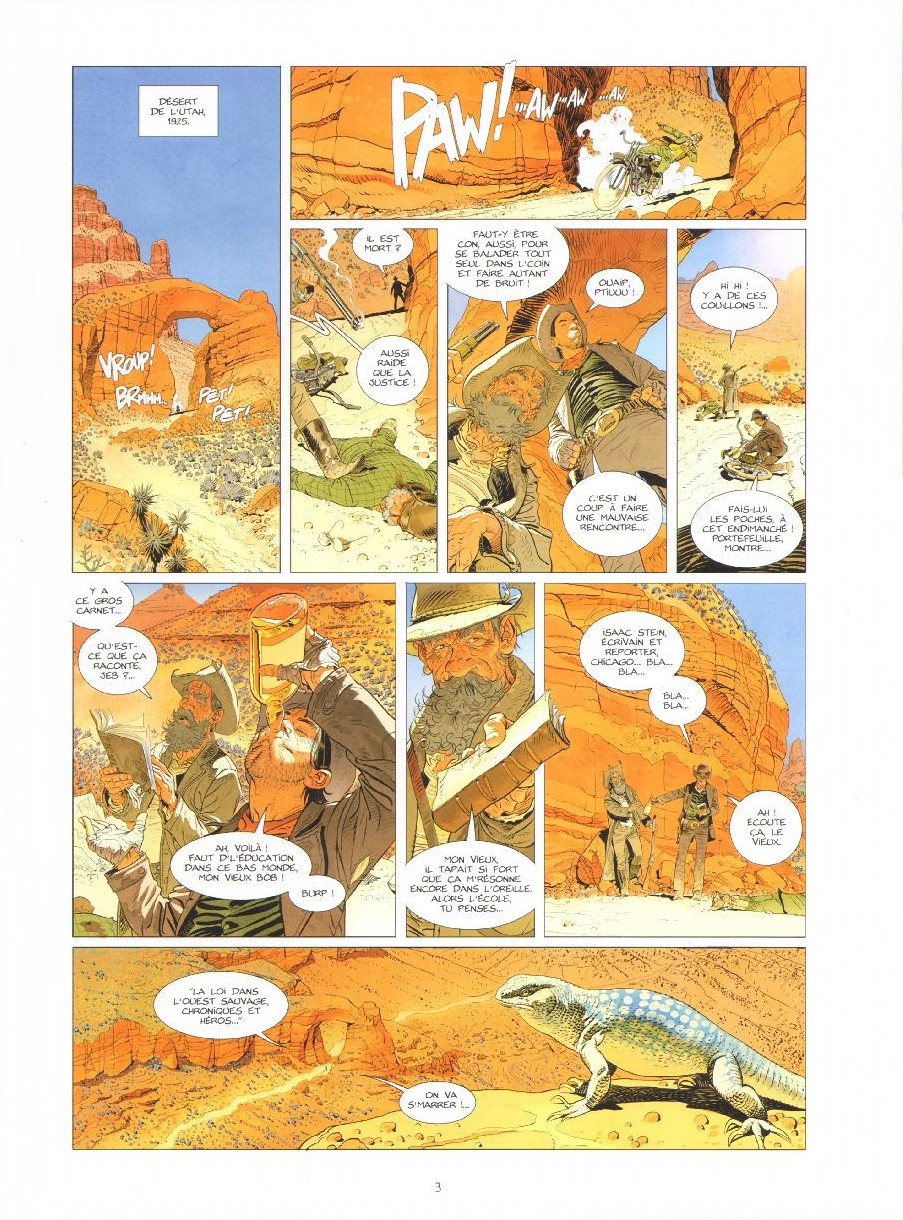 Dans le désert de l’Utah en 1925, approche au loin un véhicule motorisé. Au moment où il passe entre deux rochers, des coups de feu retentissent, l’homme s’écroule raide mort. Deux hommes s’approchent du corps, Jeb et Bob, des bandits de grand chemin qui vivent encore à détrousser des honnêtes gens. Ils lui font donc les poches, découvrent une bouteille d’alcool, quelques breloques mais surtout un livre et des notes rédigées par Isaac Stein, écrivain et reporter à Chicago. Curieux, Bob, demande à Jeb de lui faire la lecture. C’est parti pour 14 histoires sur les Lawmen of the West.