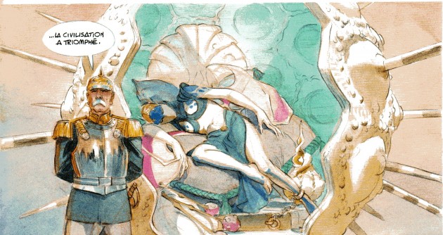 Pas de voyage spatial ou de découverte de planète exotique dans cet album, puisqu’il se passe entièrement à Paris, mais ce n’est pas un défaut tellement l’exposition interplanétaire au cœur de l’histoire est une bonne idée. Elle fait bien sûr référence aux célèbres expositions universelles de la fin du XIXe et du début du XXe siècle où les nations européennes, surtout coloniales, rivalisaient de prouesses architecturales pour démontrer leur puissance et leur rayonnement. Alex Alice reprend ce principe et l’applique à l’espace puisque les découvertes de l’Ether ont permis un nouvel âge de conquête coloniale. Séraphin et son groupe sont là pour nous rappeler toute la cruauté et la bêtise d’une telle entreprise.
