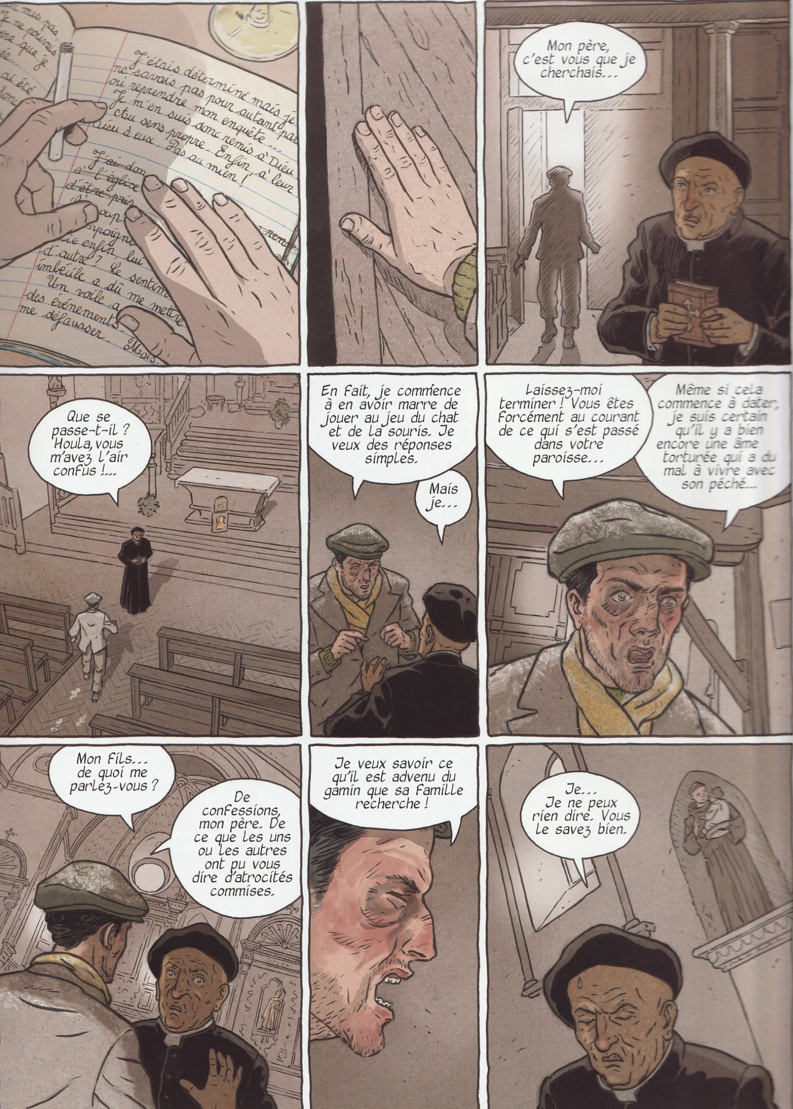 Cet album s’ouvre exactement là où le précédent s’était achevé. Dès la première page, comme dans le tome d’ouverture, le lecteur est plongé dans une double intrigue : d’un côté, le présent de 1951 à Saint-Cirq-Lapopie ; de l’autre, le passé, quelques mois plus tôt, dans le village basque d’Ezterenzubi. C’est sur ces événements que les enquêteurs interrogent Samuel. Si ses premières réponses sont directes, le dépisteur trouve rapidement le moyen de s’échapper. Les autres révélations se feront donc par des flashbacks, à travers la lecture du journal que Samuel a commencé à rédiger. Ce passé douloureux est aussi au cœur des recherches de Samuel. Il resurgit par le biais d’un récit emboîté, d’un flash-back particulièrement émouvant. Antoine Ozanam réussit avec brio à nous faire comprendre que la guerre a brisé les individus et qu’il fallait se méfier des apparences. Dans ces circonstances, le Mal peut se cacher partout. Heureusement, il existe des hommes capables de voir au-delà des apparences, un message fort qui résonne avec notre société actuelle. Côté graphisme, Marco Venanzi est toujours aux commandes. Son trait nerveux, typique du dessinateur italien, épouse parfaitement la tension des intrigues. Bien que classique dans sa mise en page, son style immerge le lecteur dans les années 1950. Les décors ruraux sont réalistes, et les rares scènes d’action, bien que sobres, sont efficaces et crédibles. Les dialogues, bien que parfois statiques, restent fluides et agréables à suivre. Dans un récit aux multiples temporalités, le risque est de perdre le lecteur. Il n’en est rien ici : une colorisation subtile et sans ambiguïté, signée Marco Venanzi et Natleg, guide le lecteur avec justesse.