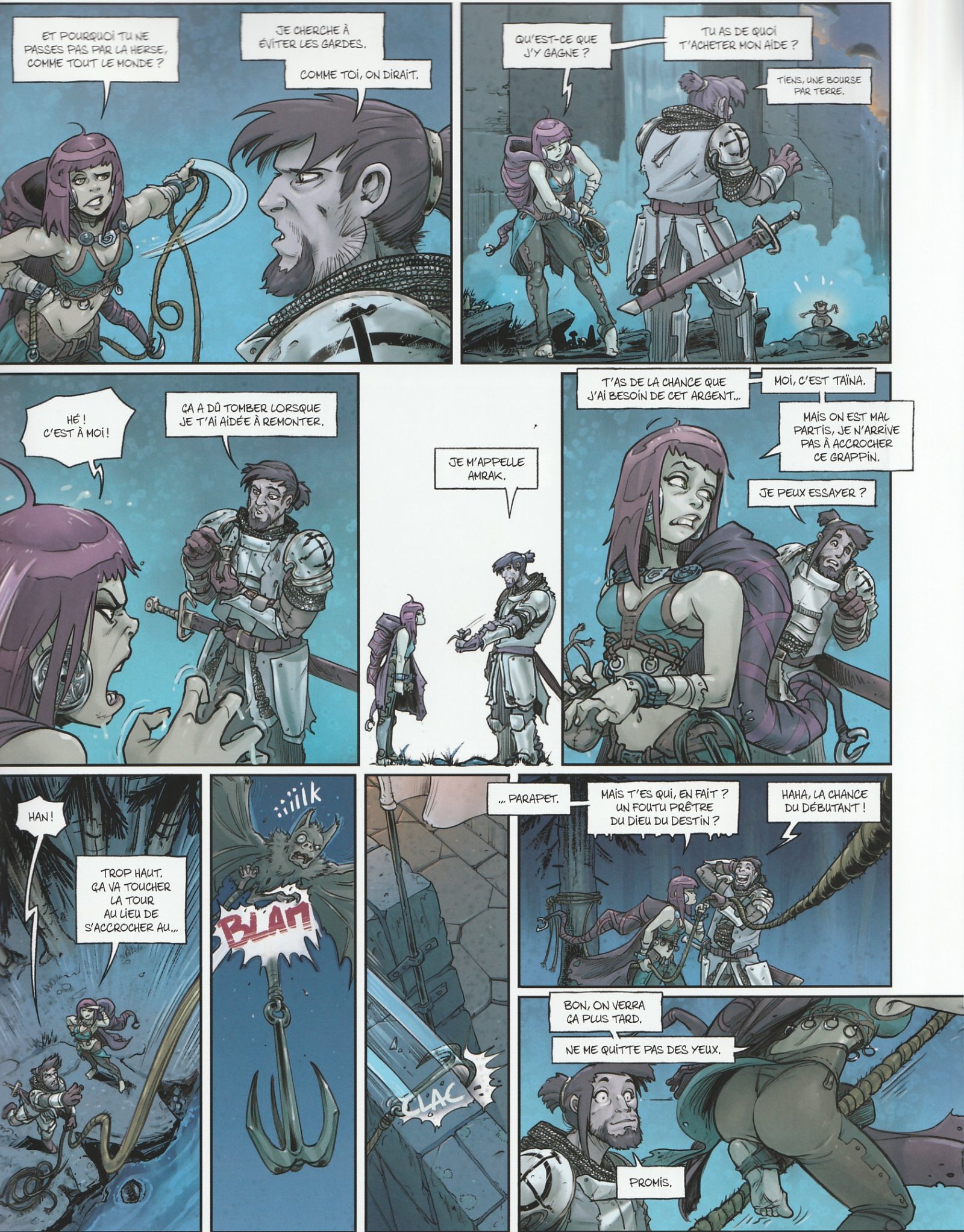 Lorsque les dieux sont mécontents, tous les mortels tremblent. C’est également le cas du grand prêtre Na Routef. Alors lorsqu’ils débarquent tous dans son temple, c’est la panique. Passe encore que le religieux ait déclaré une guerre contre l’empereur en leur nom, ils ont une mission plus importante que la paix. Na Routef doit retrouver un chevalier du temple et l’éliminer. À l’autre bout de l’empire, un templier reprend connaissance sur un champ de bataille, sans le moindre souvenir. Amnésique, c’est à peine s’il se souvient de son prénom : Amrak. Miraculé, il apprend par des détrousseurs de cadavres qu’il devrait se rendre à Amadis pour obtenir des réponses. Face à ces rustres, et à leur piège grossier, Amrak s’en sort une nouvelle fois miraculeusement. Après un voyage mouvementé, il se retrouve au pied des remparts de la cité. C’est alors qu’il fait la rencontre de Taïna. Ensemble, ils entrent dans la ville. Il faut dire qu’Amrak semble avoir une chance insolente. Comment l’expliquer ? Est-ce que cela peut avoir un lien avec qui il est ? …