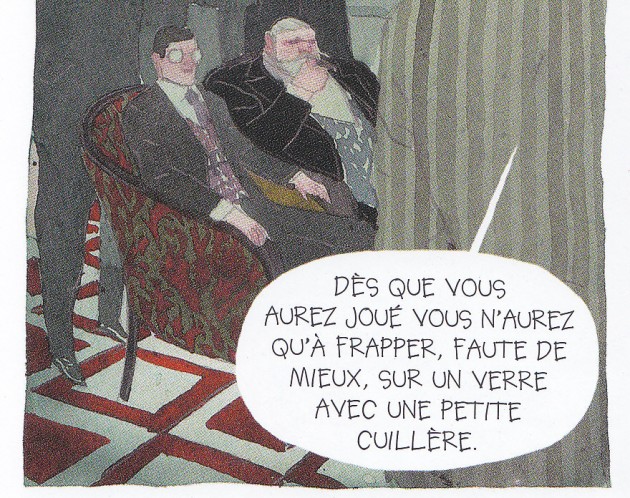 Côté dessin, pendant 112 pages, David Sala nous fait vivre cette histoire avec un style très personnel, ces personnages ne sont pas spécialement proportionnés, ce n'est pas à proprement parlé un dessin hyper réaliste, ce qui n'empêche pas une lecture agréable. Je note surtout les multiples petites trouvailles pour rendre son dessin vivant pour servir une histoire dont l'action est surtout psychologique : les gauffriers (avec 18 cases sur la page de la tête de M. B), ou une tête en gros plan sur toute la page où quelques cases se superposent, des carreaux partout : sur la couverture, tapis ou carrelage (ainsi que sur la couverture), des motifs improbable de certaines tapisseries, et la couleur qui a tendance a baver (surtout sur les cravates). Ces éléments donne plus de consistance au récit, et permet de ne jamais s'ennuyer, alors que les situations autour du jeu d'échec peuvent se répéter.