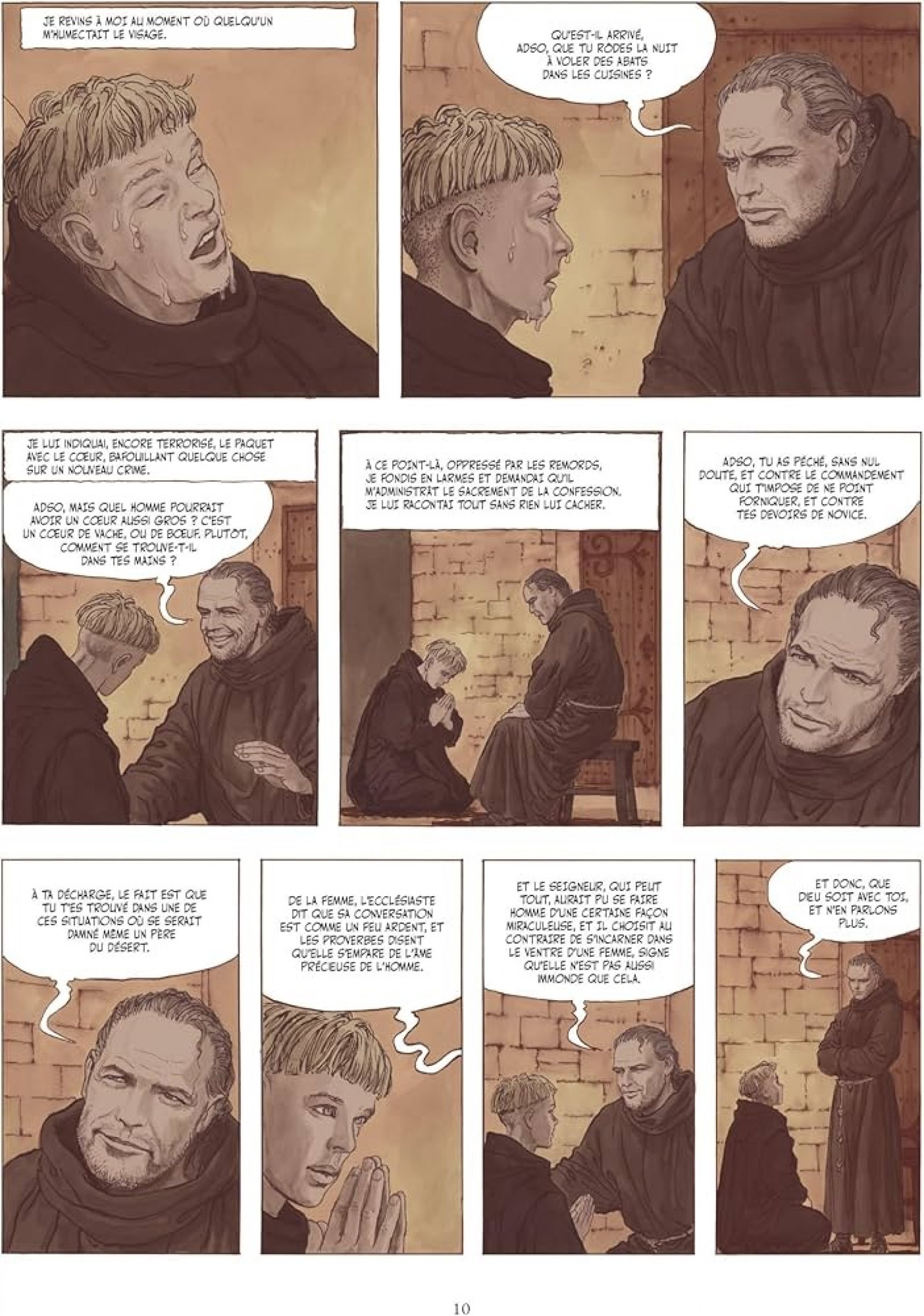 Avec ce second volume, Milo Manara livre la conclusion de son adaptation en bande dessinée du célèbre roman d’Umberto Eco, refermant une transposition en deux tomes d’un texte réputé dense et foisonnant. L’album poursuit l’enquête menée en 1327 par Guillaume de Baskerville et son novice Adso dans une abbaye bénédictine où les morts mystérieuses se multiplient, tandis que plane la menace de l’Inquisition. Cette adaptation était un réel défi pour Manara à savoir transformer un « polar philosophique médiéval » aux multiples niveaux de lecture en récit graphique lisible sans en perdre la profondeur. L’intrigue policière reste l’ossature, mais la BD conserve les interrogations majeures du livre — la place du savoir, la censure, la peur de l’hérésie et le rapport entre foi et raison. Le tome 2 accentue l’un des thèmes centraux de l’œuvre : l’idée que la connaissance peut être perçue comme une menace plus grave encore que le péché. Derrière les crimes se cache en effet une lutte idéologique autour des livres, du rire, et de la transmission du savoir, enjeux symbolisés par la bibliothèque labyrinthique, véritable cœur du mystère. L’enquête devient alors moins une simple recherche du coupable qu’une réflexion sur le pouvoir des idées et sur les mécanismes d’exclusion face à la différence ou à la dissidence, thèmes que l’adaptation met en avant. L’album maintient cet équilibre entre récit initiatique et enquête intellectuelle, où la vérité importe autant que la manière dont elle est recherchée.