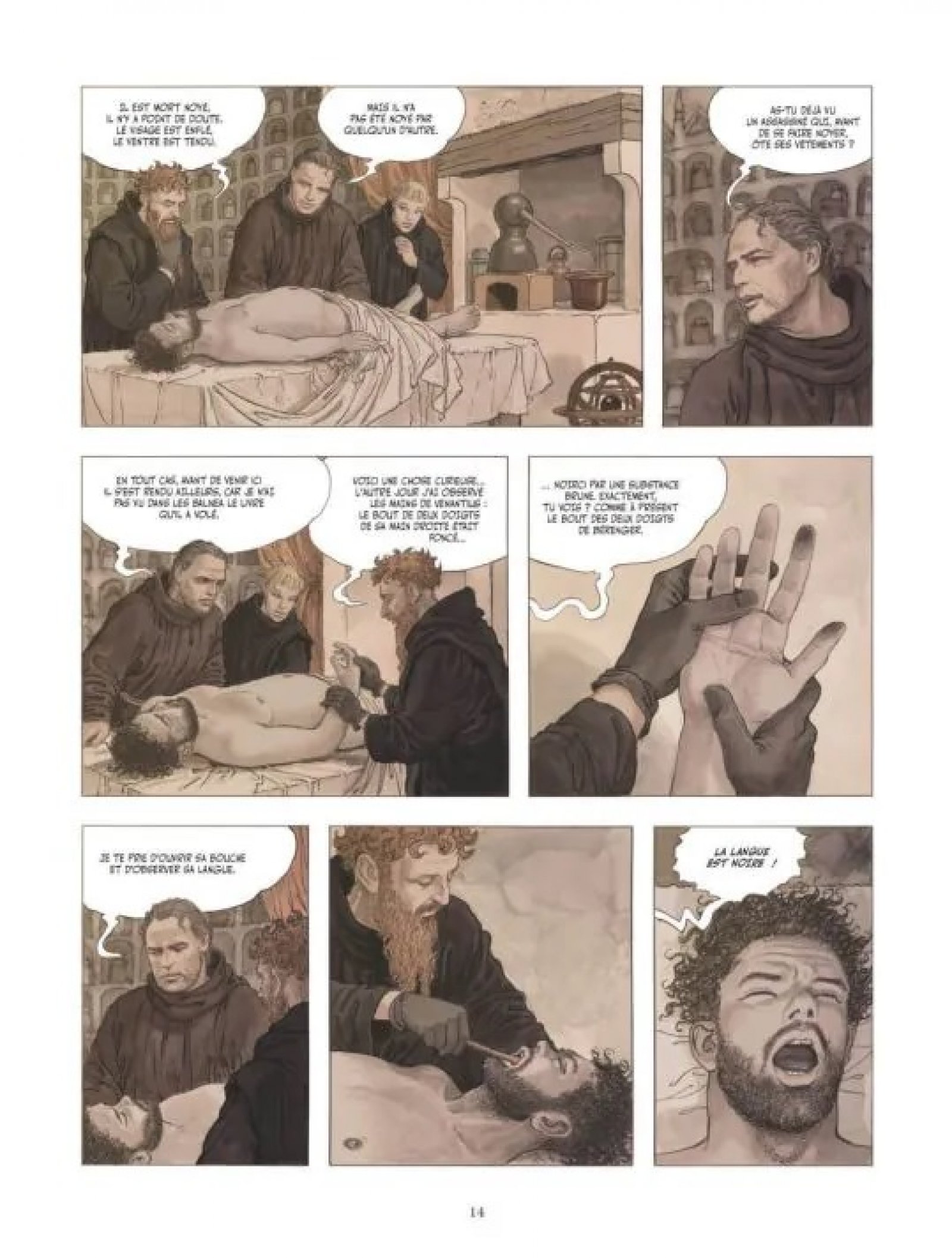 Adso revient à lui quelque temps plus tard, tiré de sa torpeur par Guillaume de Baskerville, qui le remet rapidement d’aplomb pour poursuivre leur enquête après le décès inexpliqué de plusieurs moines. Le dernier en date, nommé Bérenger, a été retrouvé noyé dans les bains, présentant toujours cette étrange coïncidence : la langue noire et certains doigts recouverts d’une substance brunâtre.