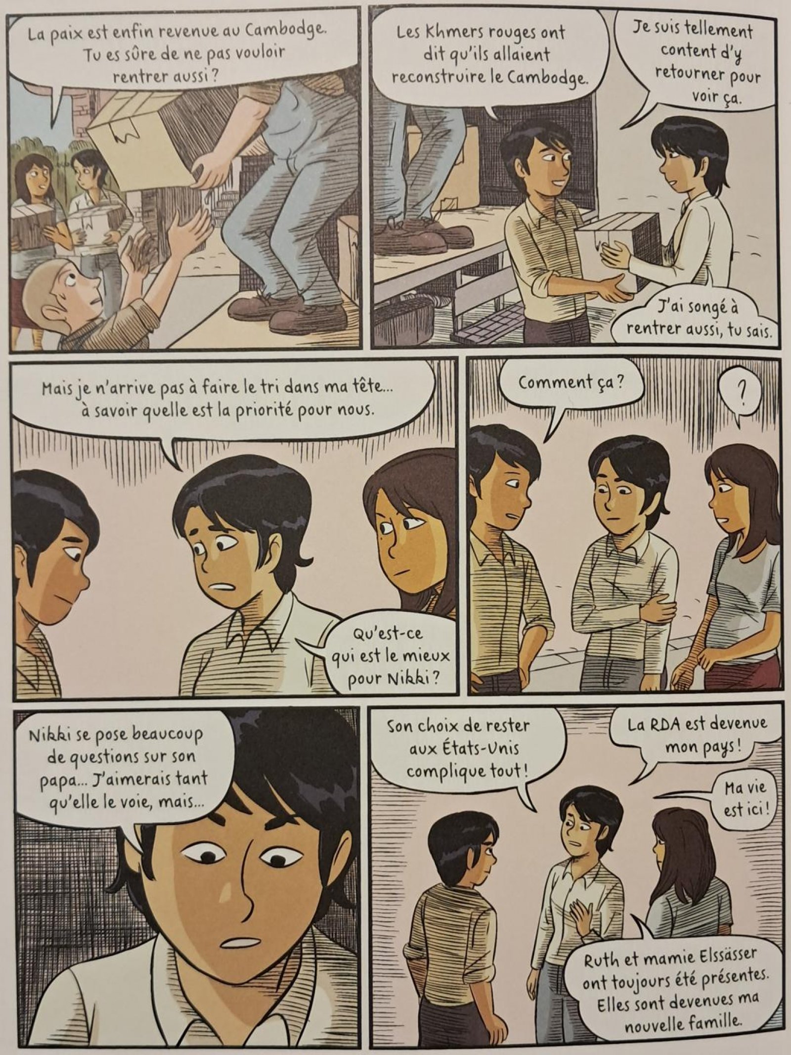 Avec cette œuvre, TIAN explore à nouveau son histoire familiale après la trilogie L’année du lièvre qui évoquait le régime génocidaire des Khmers rouges. Grâce à la subtilité présente tant dans son scénario que son dessin, TIAN nous fait rencontrer sa tante, une femme déterminée qui a fait fi des difficultés pour vivre pleinement sa passion. Celle dont il ignorait tout jusqu’à une visite que Dani lui a faite avec sa fille illustre avec nuance l’incompréhension mutuelle de part et d’autre du rideau de fer du fait d’un aveuglement et d’une propagande réciproques. Le chapitrage s’étire de 1965 jusqu’à la chute du mur de Berlin avec des pages explicatives du contexte pour mieux cerner l’histoire individuelle dans l’histoire collective.