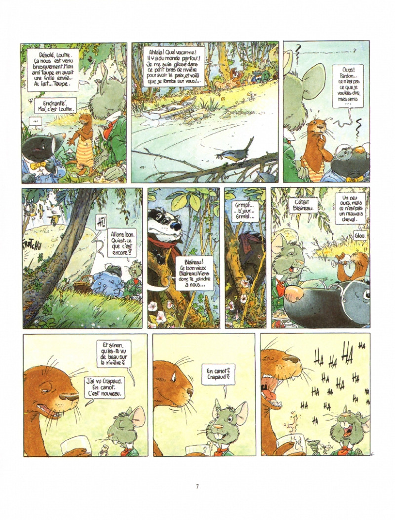 C’est aussi l’occasion de croiser Loutre, amie de Rat, puis un autre personnage bien plus extravagant , Monsieur Crapaud. Impossible de parler du Vent dans les saules sans évoquer l’inénarrable Monsieur Crapaud. Richissime, fantasque et toujours pris de nouvelles obsessions, il est le moteur de nombreuses péripéties. La moindre nouveauté devient pour lui une passion dévorante. Ainsi, lorsqu’il croise pour la première fois une automobile, c’est la révélation. Sa roulotte et ses anciennes lubies sont aussitôt oubliées : désormais, il lui faut une voiture.