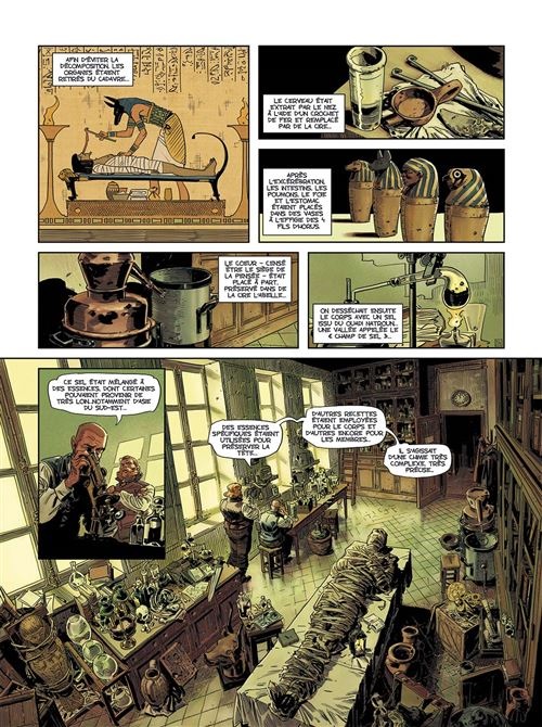 Après quelques années de repos, à l’image des sarcophages découverts par Alexandre Sardin, Corbeyran redonne vie à cet univers avec La Légende des Stryges. Rassurez-vous : il n’est pas nécessaire d’avoir lu toute la saga pour se plonger dans cette nouvelle série. L’écriture vous fait voyager à la fois dans le XIX? siècle, avec ses costumes et ses décors, mais aussi dans l’Égypte ancienne et ses dieux, à travers la découverte des sarcophages. Ces momies hors norme nourrissent un suspense et une intrigue captivante.