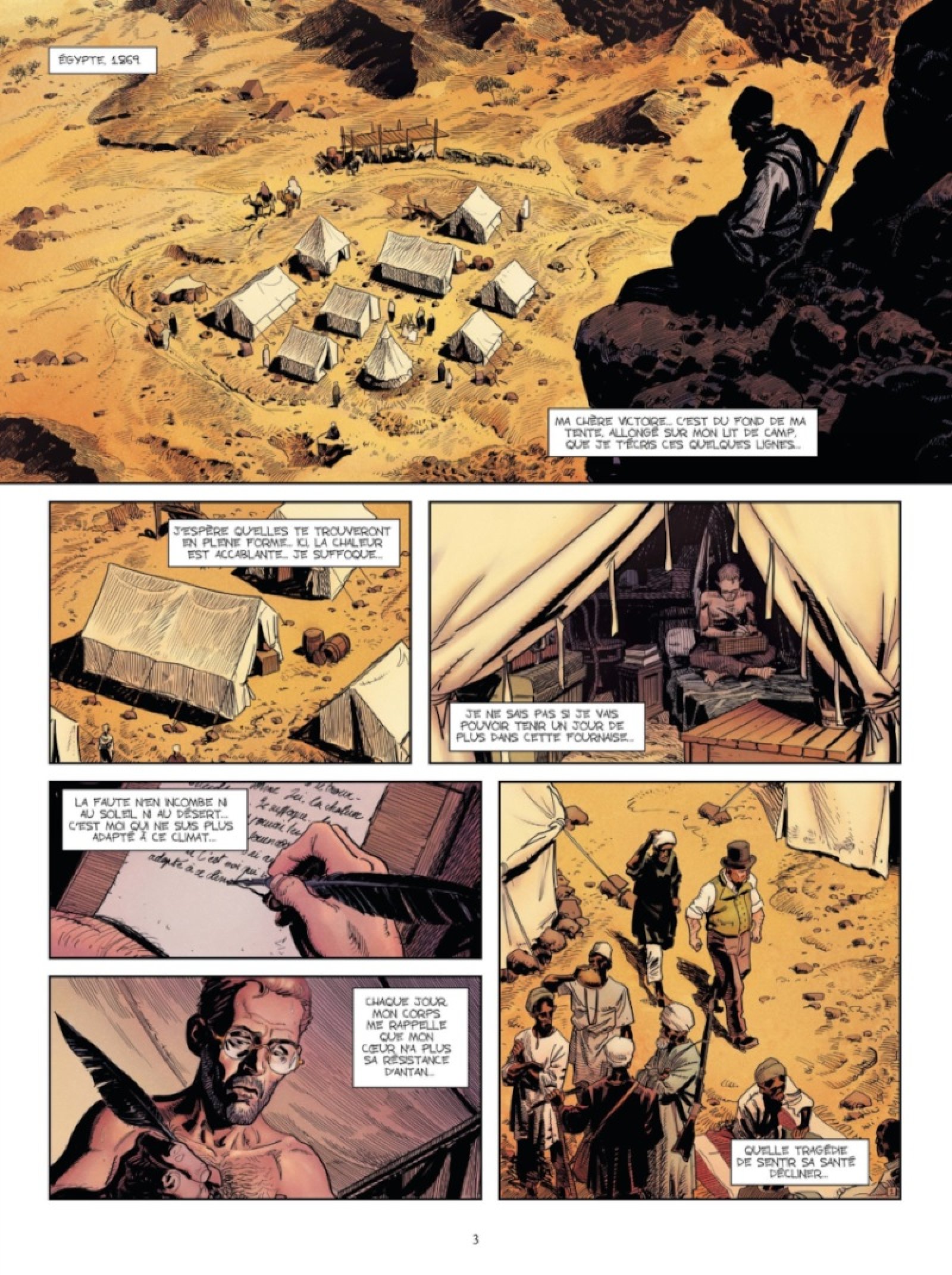Égypte, 1869. Dans un campement en plein désert, sous une chaleur étouffante, l’archéologue Alexandre Sardin s’est réfugié dans une tente pour écrire une lettre à sa bien-aimée Victoire. Il y évoque ses difficultés, l’avancée décevante de ses recherches qui piétinent, mais surtout sa très grande fatigue. Sa lettre à peine terminée, Bernat, le financier de l’expédition, entre brusquement dans la tente et lui ordonne de le suivre. Il le conduit vers une porte récemment découverte sur le chantier.