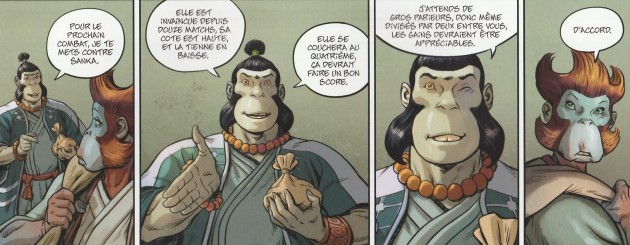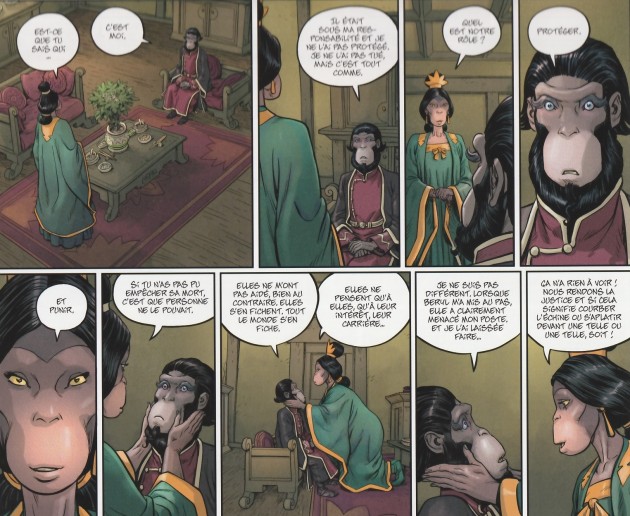 (Andoryss, Chauvel et Wong) poursuit l'évocation des intrigues qu'ils ont mis sur pied. Aucune surprise puisqu'on retrouve l'intégralité des personnages que le lecteur connaît déjà. Il y a bien quelques personnages secondaires qui captent un peu plus de lumière mais c'est davantage pour mettre en avant un autre personnage principal que pour se hisser sur le devant de la scène. Mais faisons attention car, avec ces trois-là, on est jamais sûr de rien. Ils nous ont déjà prouvé qu’ils maîtrisaient le retournement de situation comme personne. Mais revenons à nos intrigues. Tout doucement, on sent les tensions monter. Oh, bien sûr, pour le Sistre, on frise le maximum et on s'étonne même que cela n'ait pas encore explosé. C'est pour bientôt et cela devient palpable ! Cet album, c'est également le retour de la reine Astrelia. Dans quelle position est-elle ? Comment a-t-elle évoluée ? Autant de questions que les primates, et le lecteur, se posent. Mais c'est vrai que pour le reste, il y a un peu moins d'actions et davantage de politique, au sens strict, dans cet album. Et là encore, tout est relatif ! si je me remémore mes propos sur les 10 précédents albums. Cela reste sur du bon, du solide, du costaud tant pour ceux qui sont tombés dans la marmite dès le lancement de cette épopée que pour ceux qui viendraient à la découvrir. Difficile d'être original côté dessin ! C'est bien évidemment Jérôme Lereculey qui officie, avec Didier Poli comme directeur artistique. Arrivé à ce stade du cycle, il est peu dire que les dessinateurs maîtrisent cet univers sur le bout des doigts. C'est parfois à ce moment que certains cèdent à la facilité et qu'on constate une baisse qui de précision, qui de dynamisme ou qui encore de finesse. Et bien, rien de tout cela ici ! Même si on les connaît sous toutes les coutures, chaque personnage a toujours son identité, son âme propre et on les retrouve avec autant de plaisir que