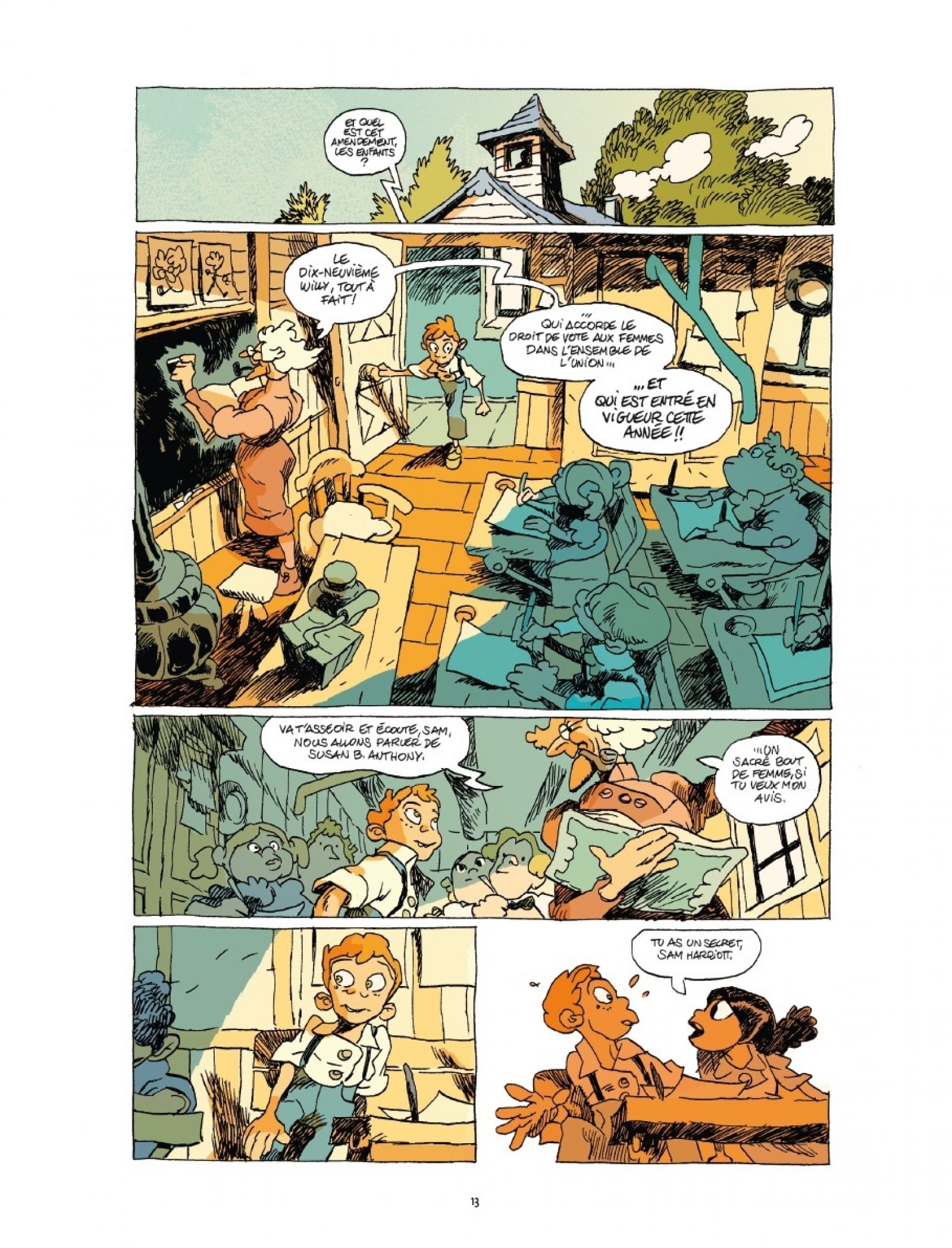 Et justement, c’est là que la BD fonctionne très bien : dans sa dimension “chronique de village”. Chatom, c’est un microcosme. Tout le monde se connaît, tout le monde s’observe, et surtout tout le monde finit par agir ensemble. L’institutrice, Mrs Ruffo, en est le cœur : une figure atypique, presque hors norme (elle fume la pipe, soigne les gens, enseigne autrement), mais profondément humaine.