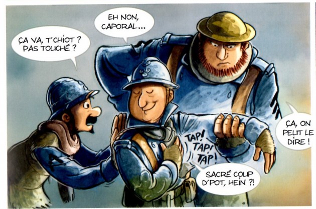 Petit retour chronologique puisque ce quatrième opus se situe en amont du premier tome. Ce saut dans le temps permet aux auteurs d’aborder le début de la guerre de Verdun et de planter le décor. Même si l’histoire en elle-même n’est peut-être pas la plus prenante de la série, elle a le mérite d’être une source indéniable d’informations, très pédagogique. Sans aucune difficulté pour les plus jeunes d’entre nous, pour découvrir les conditions de vie des poilus : le bourbier, le froid, le dégel. Mais aussi les occupations entre deux bombardements à savoir l’art de tranchée via Ledru, la musique sans oublier l’importance de la religion, des gri-gri et autres superstitions. Cet album aborde également des éléments sur l’évolution de notre société à travers l’automobile ou bien la bicyclette pliante. Mais également la participation de ceux qui ont été souvent oubliés : les soldats issus des colonies.