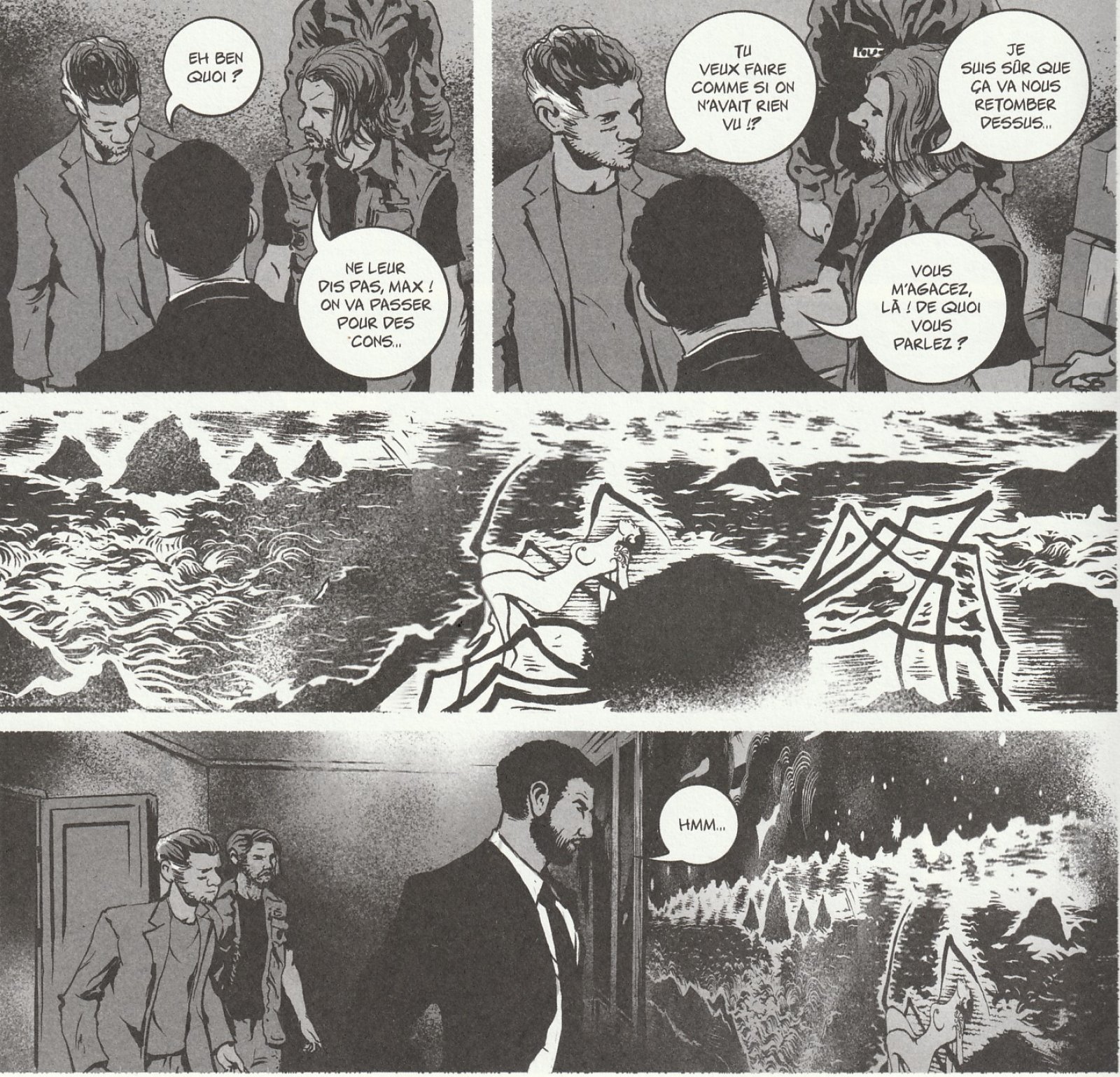 Cela commence comme une comédie romantique. Une jeune femme, Neige, renoue avec d’anciens copains de lycée, Sébastien l’éditeur, Max l’écrivain et Arthur l’aventurier. Seulement, 20 ans ont passé depuis leur dernière rencontre et les retrouvailles sont quelque peu mouvementées. Les présentations étant effectuées, l’intrigue change et prend un tour plus policier : Neige disparait et aussitôt, les trois copains se lancent à sa recherche. Il semble que cet enlèvement ait un lien avec une étrange fresque signée de Ferdinand Krebs. Tout doucement, les amis remontent le fil d’un peintre oublié de l’histoire de l’art mais cité par des artistes tels que Cocteau, Pawlowski ou l’ingénieur Belgrand. Tout doucement, ils entraînent le lecteur dans un univers fantastique peuplé de monstres divers et variés, « la vieille mer ». Et si, au départ, on se dit que l’abus de shit est peut-être à l’origine de leurs extrapolations, on est tout de même obligé de se faire une raison : on plonge dans un récit sombre, digne de Stephen King ou Guillermo Del Toro, où l’humanité prend une sacrée claque. Une histoire qui nous fait remonter le temps avant les Parisiens, avant les premiers hommes, aux origines de notre monde. Pourtant, j’avais comme une appréhension au vu de l’épaisseur de l’album et, je l’avoue, j’ai été contraint de faire une pause. Mais je n’ai jamais pu me sortir de cette histoire de la tête. Je ne pensais qu’à une chose : découvrir la fin ! Là aussi, le dénouement est inattendu et spectaculaire. Ayant déjà collaborés sur la série Metropolis ou La brigade chimérique, scénariste et dessinateur sont totalement en symbiose. La construction semble simple mais lorsqu’on y regarde de plus près, elle nous engloutit sans qu’on s’en rende compte ! Le trait est d’une grande finesse et d’une grande délicatesse par ailleurs renforcée par l’utilisation du noir et blanc. Là aussi, les choix sont judicieux car l’horreur s’adapte à merveille avec ces teintes. L’atmosphère, que ne renierait certainement pas HP Lovecraft, est parfaitement rendue par certaines vignettes, par la représentation d’un Paris antédiluvien, mélange de toutes nos peurs et par les références surréalistes.