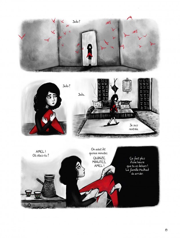 Symboles d’espoir, les oiseaux guident la jeune fille dans sa quête de sécurité, vers un endroit où reconstruire sa vie. En alliant un noir profond à des couleurs vives comme le bleu, le rouge et le jaune, Nadia Nakhlé nous offre des illustrations raffinées et lumineuses, d’une douceur incroyable, presque féeriques. Le texte, quant à lui très courts, laisse une place centrale au dessin qui nous réconforte et nous permet de mesurer tout ce que nous ne voyons pas. Ce roman graphique restera pour moi une expérience esthétique et émotionnelle très intense une lecture que je recommande vivement.