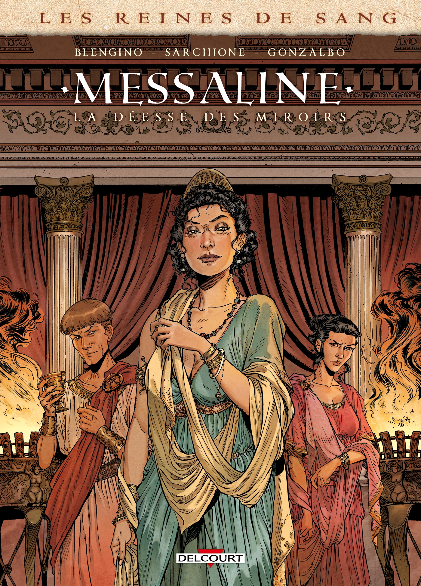 On ne présente plus la collection Les reines de sang qui réhabilite le rôle important des femmes dans l’Histoire du monde. Pourtant, la série réussit encore à surprendre avec un nouveau concept : une pentalogie romaine consacrée non pas à une mais à trois femmes qui eurent un rôle majeur dans l’empire Romain, mais dont le commun des mortels a oublié le nom. Pour cet album central, ce n’est plus Agrippine qui est la vedette mais sa nièce, Messaline. Et l’album s’ouvre la scène finale : assassinée, Messaline souhaite rétablir la vérité, sa vérité sur son histoire, sur sa vie. Commence alors un long flash-back qui nous fait remonter le temps jusqu’à l’enfance de la future impératrice. Quelques pages dont le seul objectif est de justifier le sous-titre la déesse des miroirs et d’émettre une hypothèse sur une forme de bipolarité narcissique de la plus belle femme de Rome. Mariée enfant à l’oncle de Caligula, Messaline est une sorte d’Emma Bovary avant l’heure. Amoureuse de l’amour et à la recherche de l’amoureux ultime, elle va enchaîner les déconvenues. Il faut dire que le hasard et les affres de la politique romaine vont faire d’elle la maîtresse d’un empereur et l’épouse de son successeur. Grisée par ce pouvoir, elle ne va pas voir les intrigues de sa tante Agrippine. C’est donc une manière originale de poursuivre la biographie de la mère de Néron sans lui confier le rôle principal. Tout cela donne une biographie au rythme agréable marquée par les ellipses judicieuses qui l’allègent sans rien cacher au lecteur. Le dessin est l’œuvre d’Antonio Sarchione. Le travail du dessinateur italien, à qui on doit également la trilogie Les Trois Julia, est en tout point remarquable. Pour renforcer l’aspect antique, il opte pour un trait assez classique. Il ajoute derrière ces personnages charismatiques des décors précis et très détaillés ; indubitablement le résultat de recherches fouillées. Pour autant, dès la séquence d’ouverture, on sent beaucoup de nervosité dans le dessin. Des bandes, des inserts, des pages complètes, on comprend que Messaline va dévorer la vie par les deux bouts avec, en point d’orgue, cette sublime double page mêlant orgie et assassinat. Il faut bien se l’avouer, Messaline est sublimée par le trait de Sarchione, à la fois sensuelle sans devenir vulgaires : une vraie impératrice en sorte !