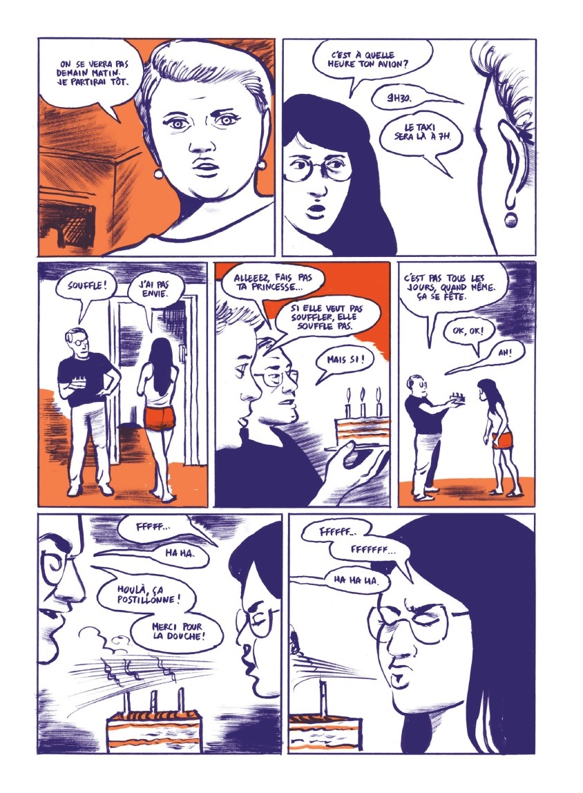 Graphiquement, on est dans la pure tradition de la BD indépendante : un trait épuré, concentré sur les personnages et les dialogues, soutenu par une palette de couleurs dominée par l’orange et le noir. Un parti pris original qui colle parfaitement au récit et à son climat de suspense.
