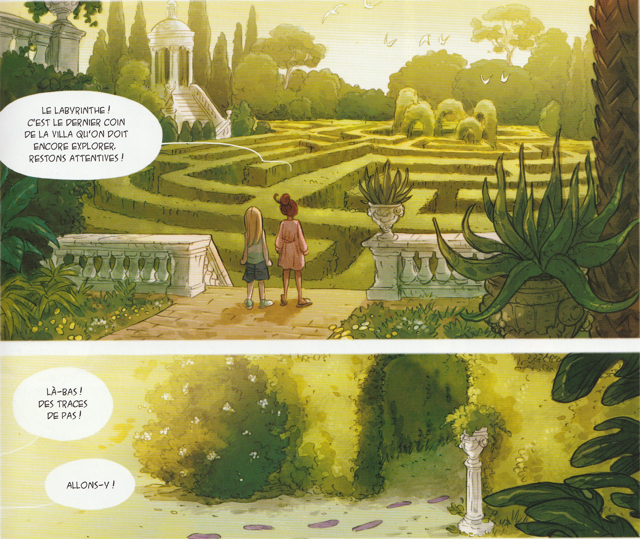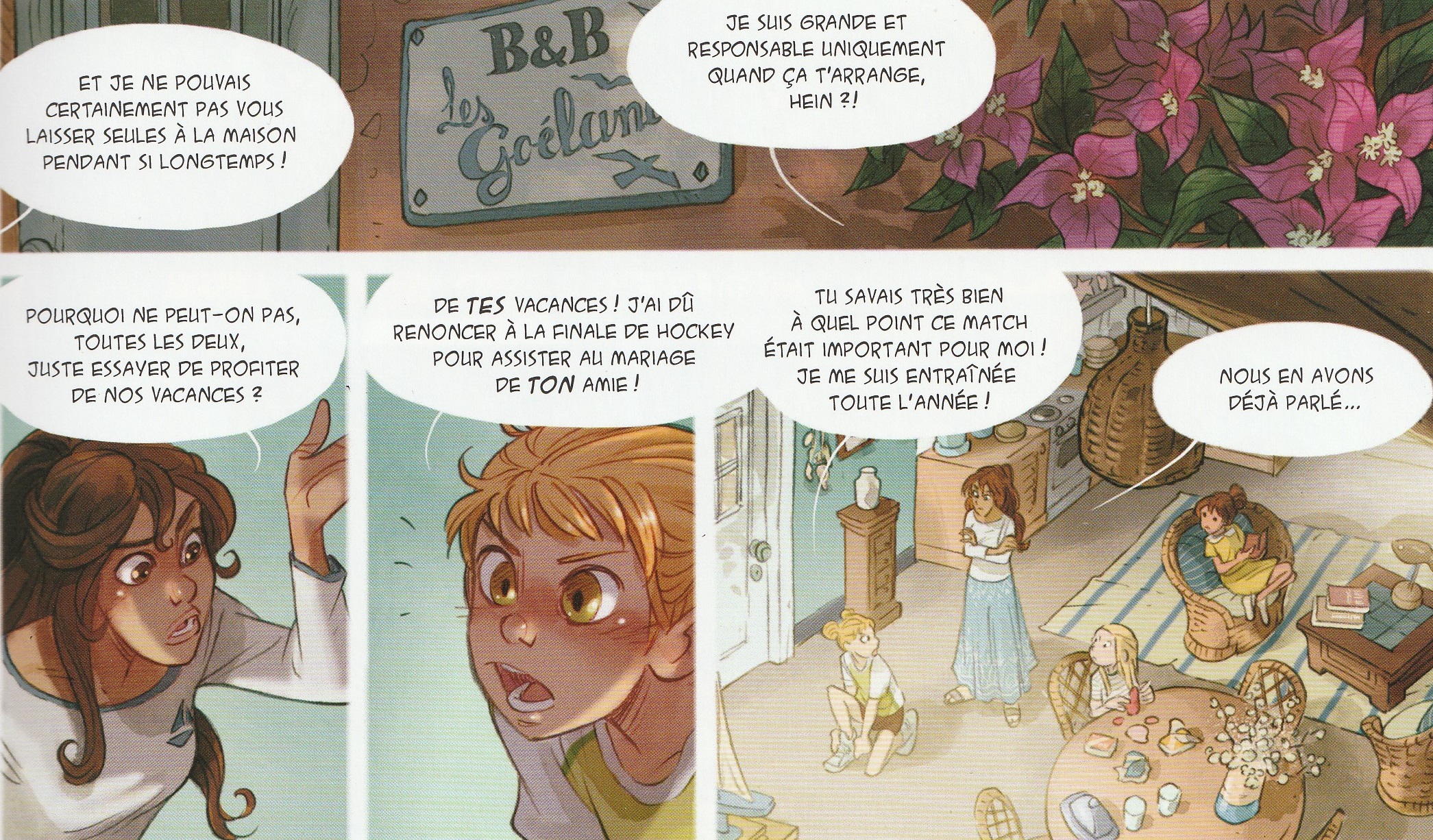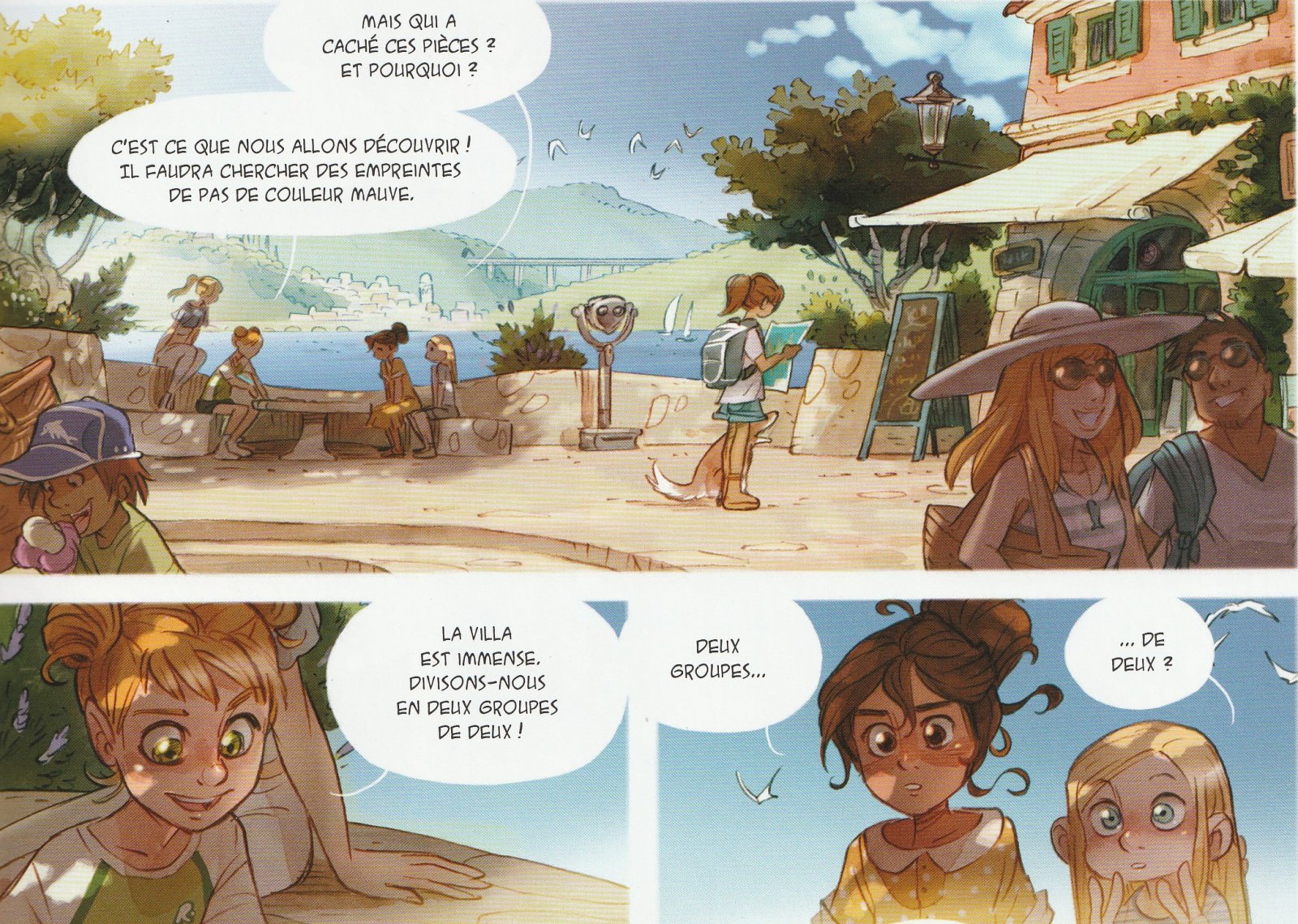 Parmi toutes les mauvaises nouvelles de la rentrée, il y a une parution qui ravira tous les préados, et leurs parents : la sortie du nouveau Sœurs Grémillet ! Depuis maintenant 4 ans, les aventures de ces trois frangines se sont taillées une place de choix dans le cœur, et la bibliothèque, des jeunes lecteurs et surtout des jeunes lectrices. J’en veux pour preuve, qu’à la maison, je n’ai pas été le premier à le découvrir ; devancé par mes 2 filles ! Toutes fébriles, elles ont littéralement dérobé l’album sur mon bureau. Du coup, la pression est grande au moment d’écrire cette chronique. Il faut dire que, étant un homme et nettement plus vieux que le cœur de cible, je me suis aussi pas mal attaché à cette série, mélange de récit d’initiation et de féerie. Sauf que, dès la première page, nous assistons à un sacré changement de décor. On savait que l’ambiance au sein de la famille pouvait dégénérer ; on débarque en pleine guerre mondiale. Magda, la mère, est invitée à célébrer le mariage d’une de ses meilleures amies. Et ces filles, bien évidemment, sont de la partie. Le problème vient de la date, elle coïncide avec la finale de hockey de Sarah. En bonne ado, elle pique donc une sacrée crise à sa mère sur le mode « je suis grande et autonome, laisse moi faire ce que je veux ! ». Scène que tous les parents reconnaîtront. Une fois sur place, Sarah retrouve Aurélie, la fille de la mariée, totalement laissée pour compte par sa mère. Avec cette nouvelle amie, l’ainée va, elle aussi, délaisser ses sœurs, malgré une nouvelle enquête. Les deux groupes vont découvrir d’étranges pièces de puzzle laissées par de non moins étranges traces de pas mauves. Pour le coup, le côté féerique laisse quelques plumes par rapport aux albums précédents. On a l’impression que le scénariste souhaite davantage évoquer la psychologie: les prémices de rupture du cordon, la révolte adolescente et les relations très houleuses mère-fille. Si cela parlera sans équivoque aux parents, les adolescents et adolescentes devraient aussi y trouver leur compte grâce aux décors somptueux et à la mise en avant des relations entre pairs. Et puis, tout le monde craquera une nouvelle fois pour les magnifiques dessins d’Alessandro Barbucci. Avec beaucoup de finesse, le dessinateur italien donne une vie et une âme à chacune de ses héroïnes. Avec le talent qu’on lui connaît, il montre la rage adolescente de Sarah, la gentillesse de Lucille et la naïveté fleur bleue de Cassiopée. Avec une pointe de ruse, il nous laisse deviner le caractère d’Aurélie. Tout cela se déroule sur une superbe Riviera, dans une île enchanteresse et une magnifique villa. Et comme il gère également la mise en couleur, il est impossible de ne pas évoquer les fantastiques jeux de lumière qui nous permettent de prolonger encore un peu les vacances.