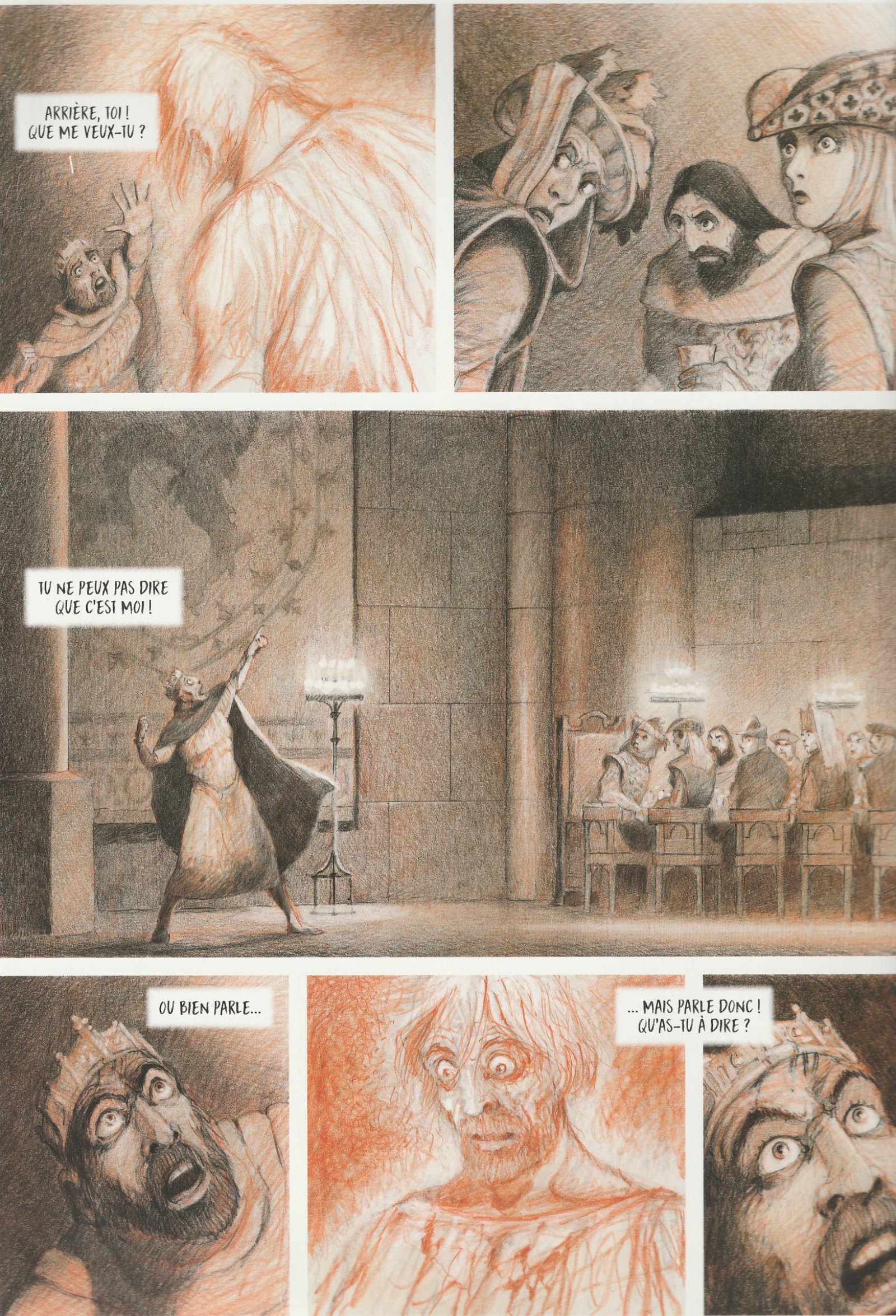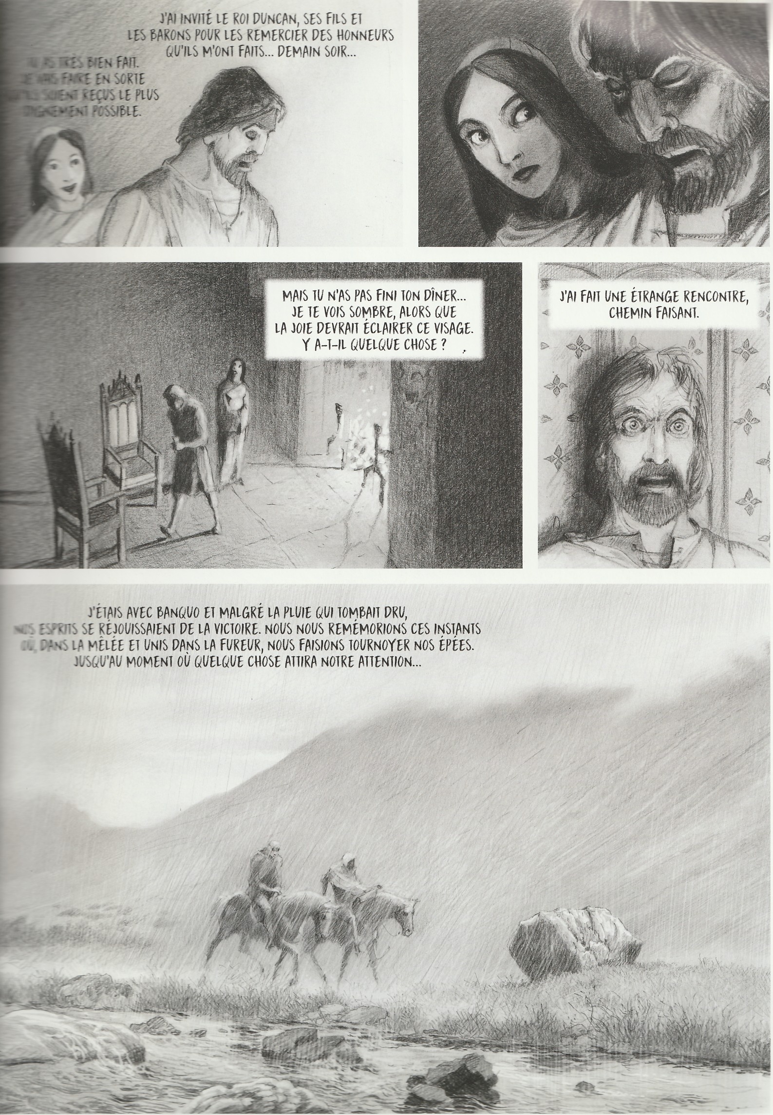 Après l’Enfer de Dante et Don Quichotte de la Manche, Gaëtan et Paul Brizzi s’attaquent à un autre monument de la littérature mondiale. Une nouvelle fois, cette adaptation est l’occasion de faire connaître ce chef d’œuvre de la littérature britannique à des novices et surtout au plus grand nombre. Une nouvelle fois, c’est l’occasion pour les frères Brizzi de nous montrer leur perception de cet ouvrage patrimonial. Première différence, là où le dramaturge anglais découpe sa pièce en cinq actes, les artistes français réalisent une œuvre sans réelle coupure. Là où Shakespeare exprime les tourments intérieurs de ses personnages par une prose oratoire magnifique, Paul et Gaëtan Brizzi utilisent les jeux de lumière. Pour autant, les deux frangins n’en oublient pas le rythme. Il ne leur faut que quelques pages pour exposer l’intrigue. Sauf qu’ils n’hésitent pas à s’affranchir des règles d’unité du théâtre. C’est ainsi que lorsque Macbeth raconte sa rencontre avec les trois sorcières, les sœurs du destin, son récit prend une toute autre dimension. On la vit à hauteur d’homme, avec les yeux de Macbeth. Il en est de même pour les hallucinations des époux maudits. Au-delà des mots, le lecteur voit les fantômes et le sang. Tout cela apporte une version plus dynamique et bien plus visuelle de l’œuvre. D’autant que les Brizzi ne changent pas une équipe qui gagne. Ils reconduisent donc leur style si particulier. L’effet crayonné est absolument irrésistible. Cela apporte une expressivité décuplée aux personnages : la moindre ride, le moindre regard prend une épaisseur et une importance primordiale. Pour autant, le duo nous offre de pleines pages, voire des doubles pages de toute beauté dans lesquelles les détails fourmillent. C’est particulièrement vrai dans les scènes de guerre : on entend les épées frapper les boucliers, on monte les échelles à côté des fantassins, on entend le bruit des arcs. Les dessinateurs améliorent même leur technique en insérant des scènes en noir et rouge. Le rouge sanglant devient alors la couleur des visions maudites. Cela aide les lecteurs autant que cela crée une atmosphère pesante et fantastique.