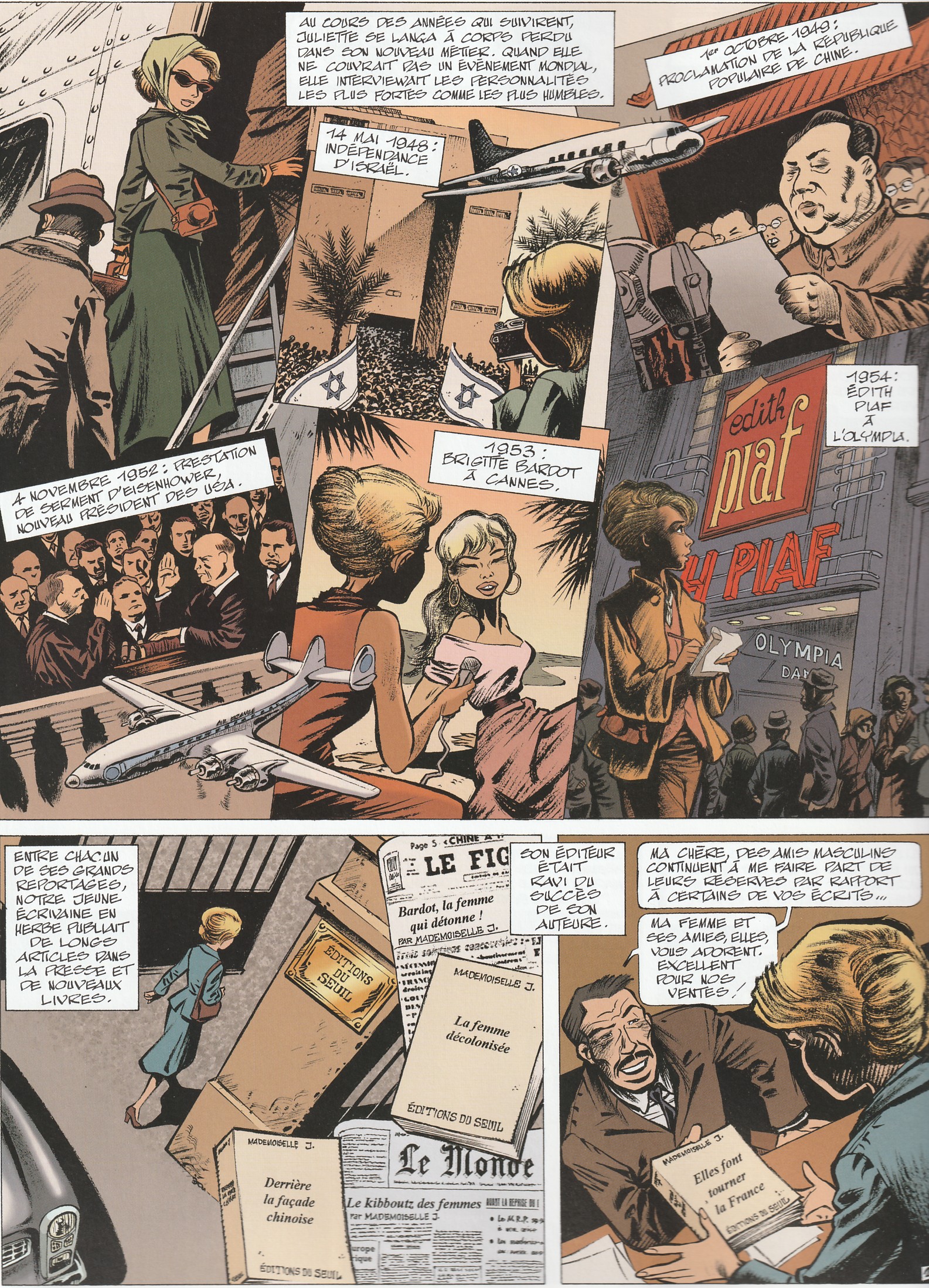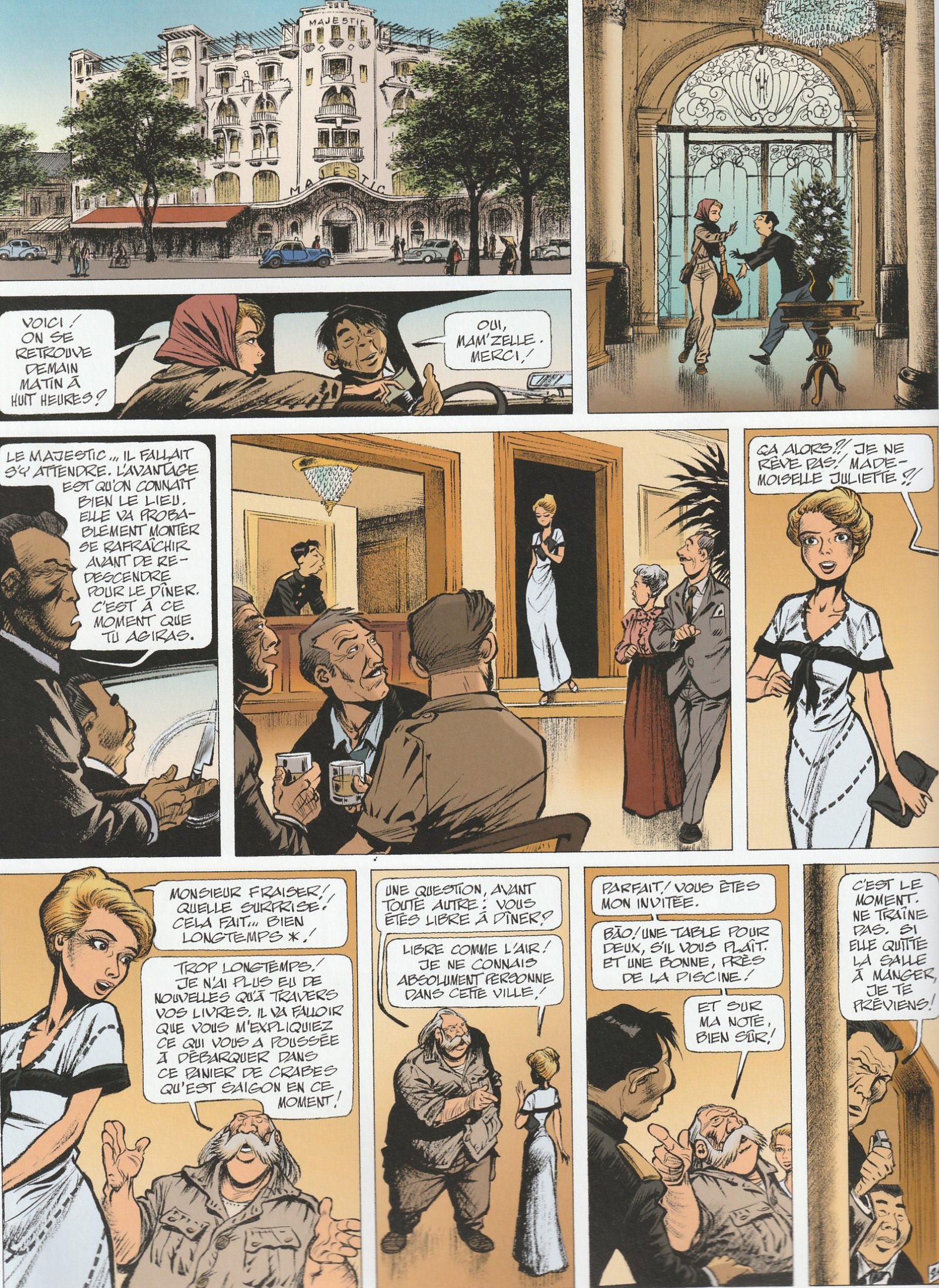 C'est toujours un grand plaisir de retrouver les premières pages de Mademoiselle J. C'est l'occasion de retrouver la famille Destrée, les enfants au coin du feu écoutant une histoire de leur oncle pendant que leur mère prépare la dinde. Cet élément de récit emboîté apporte une touche réaliste et toujours extrêmement originale en même temps qu'un regard mi adulte mi enfantin sur les aventures de Juliette. C'est ainsi qu'on nous résume en quelques vignettes les précédents voyages de Mademoiselle de Sainteloi. L'exploit qu'elle a accompli lui a permis de se faire un nom dans le journalisme et l'édition. Si elle ne fait pas l'unanimité, elle profite de sa notoriété pour faire avancer les causes qui lui sont chères et interviewer tous ceux qui font l'actualité en ce début des années 50. Lors d'une séance de dédicace, elle fait la rencontre d'une nonne indochinoise pourchassée par des agents du Viet-Minh. En effet, la guerre d'Indochine se termine et la France s'apprête à rendre les pouvoirs à Hô-Chi-Minh. Ayant découvert une lettre dans son sac, Juliette la rapporte à la mère supérieure. Elle lui raconte alors l'objectif de sa congrégation : prendre soin des enfants des vétérans de la Wehrmacht engagés dans la légion étrangère à la fin de la guerre et qui se sont battus en Indochine. En soit cela pourrait constituer l'intrigue principale de cette aventure. Sauf que Yves Sente y ajoute une consonance encore plus familiale. Alors qu'elle raconte sa journée au docteur Lannoy, ce dernier fait un malaise. Tout cela a réveillé des souvenirs chez le vieil homme : une ancienne carte postale envoyée d'outre-tombe par la mère de Juliette. Voilà donc les deux jambes sur lesquelles notre héroïne va courir vers l'aventure. Mi récit de voyage, mi quette familiale et mi récit d'espionnage, l'intrigue s'écoule sans temps mort. Et comme le monde des aventuriers est tout petit, Juliette va revoir de nombreux personnages secondaires qui vont jouer des rôles déterminants. Parmi eux, se trouve un personnage récurrent qu'on retrouve également avec grand plaisir et qui est comme l'ange gardien de Juliette, c’est Ptirou ! Une nouvelle fois, il va être convoqué dans cette aventure et jouer un rôle catalyseur dans le courage de notre héroïne. Il ne faudrait pas oublier les valeurs défendues par Mademoiselle J : la justice, la protection de l'enfance et des innocents d'une manière générale. Tout cela se retrouve dans les démocraties naissantes d'après-guerre. Le dessin de Verron est toujours aussi beau et généreux. Les personnages sont toujours aussi irréprochables et le trait charbonneux diffuse beaucoup de charme et rend les personnages extrêmement expressifs. Si le dessinateur maîtrise les paysages parisiens (bien qu'ils changent de décennies à chaque album), il prouve une nouvelle fois qu'il est un acharné de labeur tant le travail de recherche et de préparation est dense. La conséquence logique est que l'Indochine de toute beauté, sans cacher pour autant les travers de la colonisation française. Enfin, la colorisation d'Isabelle Rabarot est une nouvelle fois particulièrement réussie.