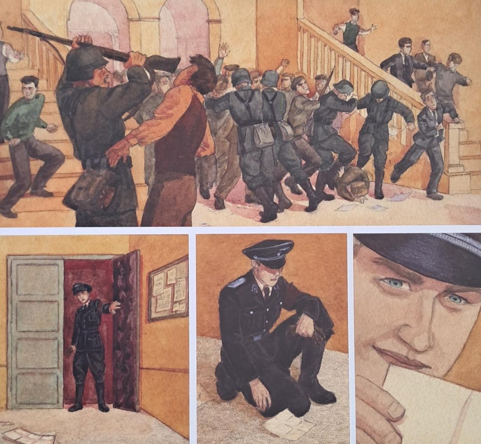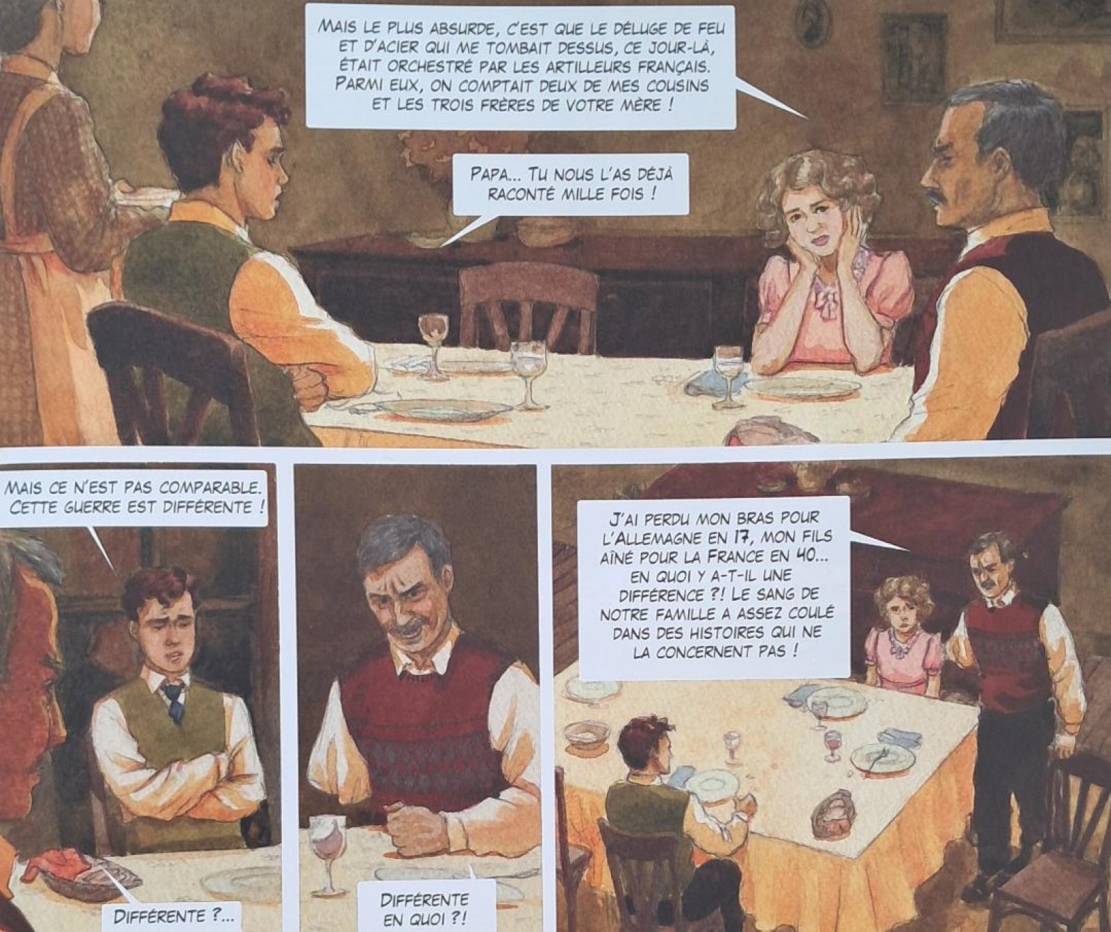 Cet ouvrage relève du récit d’apprentissage avec un jeune homme confronté aux affres de l’Histoire. Il est ainsi intéressant et instructif de suivre sa destinée ainsi que celle de sa famille. Et même si cette histoire relève de la fiction, le déchirement des malgré-nous y est magistralement présenté tout en nuance, avec humanité et sans manichéisme. Il est en effet très difficile de juger ces incorporés de force dont le territoire s’est retrouvé d’un côté ou de l’autre de la frontière entre 1870 et 1945. La lecture de cet ouvrage est plaisante avec un récit captivant, mais qui s’achève malheureusement de façon abrupte et décevante. Une telle épopée ne peut pas se terminer ainsi sauf à penser qu’une suite est projetée. Par ailleurs, le travail de Marie TERRAY est remarquable avec un trait réaliste portant avec précision les expressions des visages, et l’utilisation de l’aquarelle qui sublime les arrière-plans et les paysages.