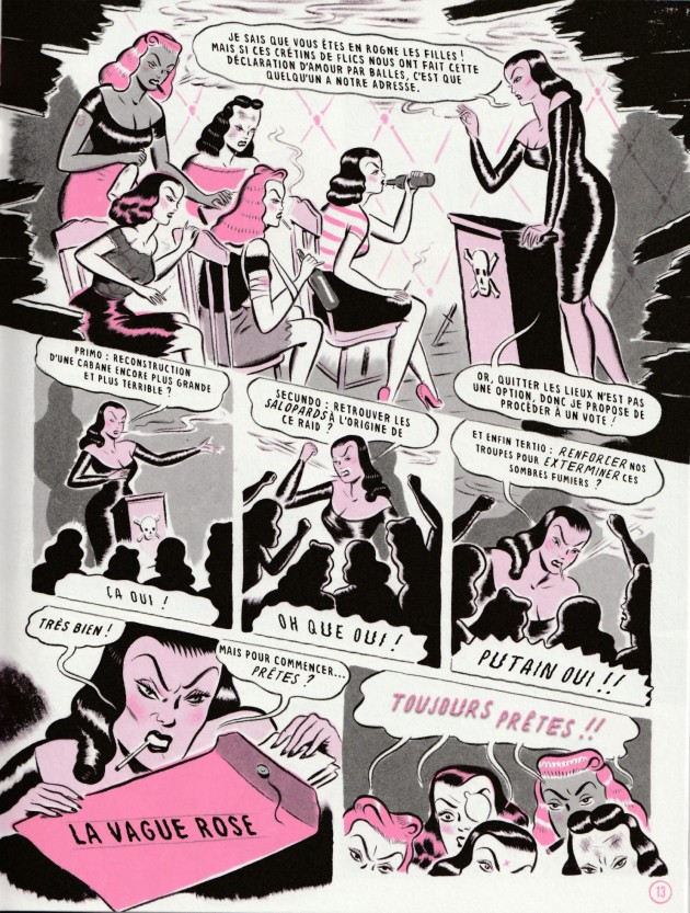 Kill Bill ! Vicieuses, les filles capturent le commando et réussissent à le faire parler. Dès lors, leur vengeance va être terrible. Elles décrètent une vague rose sur la ville : pillages, dégradations, vols et surtout alcool et luxure. Pour le maire, le débonnaire et pleutre Ham Hocks (toujours obnubilé par ses porcs), il faut décréter la riposte. Il engage donc une pauvre mécanicienne en jouant sur ses difficultés financières et la mauvaise santé de son grand-père. C’est alors à une sorte d’histoire de gangsters à l’ancienne que nous invite à Ryan Heshka. Sauf que