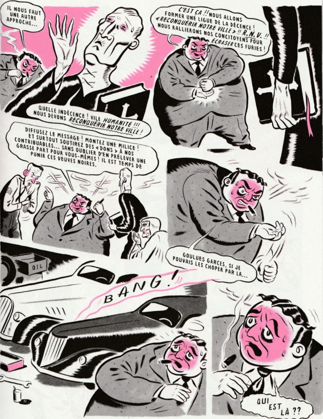 l’artiste canadien connaît bien son époque et il remplace Al Capone par une sacrée équipe de femmes. Auto-publié en 2015, deux ans avant l’affaire Weinstein, on imagine le boucan que l’album a dû causer outre-Atlantique. Dans l’Hexagone, c’est toujours aussi bruyant ! Loin d’être des modèles de vertu, ces femmes brisées par la vie et les hommes ne réclament qu’une chose : la liberté ! Côté masculin et dévot, c’est Tartuffe et compagnie et seul le dollar est roi. Tout le monde trinque et c'est totalement jouissif ! Il faut dire que si le scénario est explosif, les dialogues sont des bombes atomiques. C’est irrévérencieux au possible et donc tout bonnement génial ! Pour le dessin, c’est absolument pareil ! Connu, et reconnu, pour ses représentations féminines, Ryan Heshka nous régale d’un sex-appeal assumé et de traits caricaturaux hilarants. La mise en page est extrêmement vive et dynamique et la colorisation en noir et rose (bon OK, il est un petit peu blanc, faut pas trop fâcher Donald Trump !) tranche du girl Power habituel.