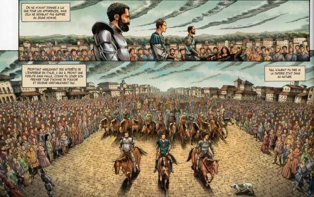 Depuis quelques années, on assiste à un retour de l’Histoire de la Troisième République. Oubliées l’Ecole des Annales et la Nouvelle Histoire, l’heure est aux figures héroïques. Et la bande dessinée ne fait pas exception. Après les Reines de sang et les Champs d’honneur,  les éditions Delcourt/Soleil s’intéressent à une famille qui a marqué l’histoire européenne et française, puisqu’elle a donné au royaume de France, deux reines parmi les plus charismatiques. Mais plutôt que de s’arrêter sur ses personnages marquants de l’histoire de France, le scénariste Olivier Péru s’est concentré sur ceux qui ont davantage marqué le Piémont italien. C’est ainsi qu’après Laurent et Jules, c’est désormais à  Cosme  d’être sous les feux de la rampe. Comme à l’accoutumé, Olivier Péru  fait de la cité de Florence sa narratrice. Passé la surprise du premier opus, il reste l’intérêt du procédé : cela permet une mise à distance des principaux protagonistes. Pour le reste, le scénariste narre les circonstances de la prise de pouvoir de Cosme puis les péripéties pour se maintenir dans un jeu incessant de flash-back. On y devine Cosme monter son cousin Lorenzaccio contre Alexandre. Supposition rapidement, trop rapidement, confirmées. Hormis ce détail, le scénario repose sur des bases solides et une grande documentation.