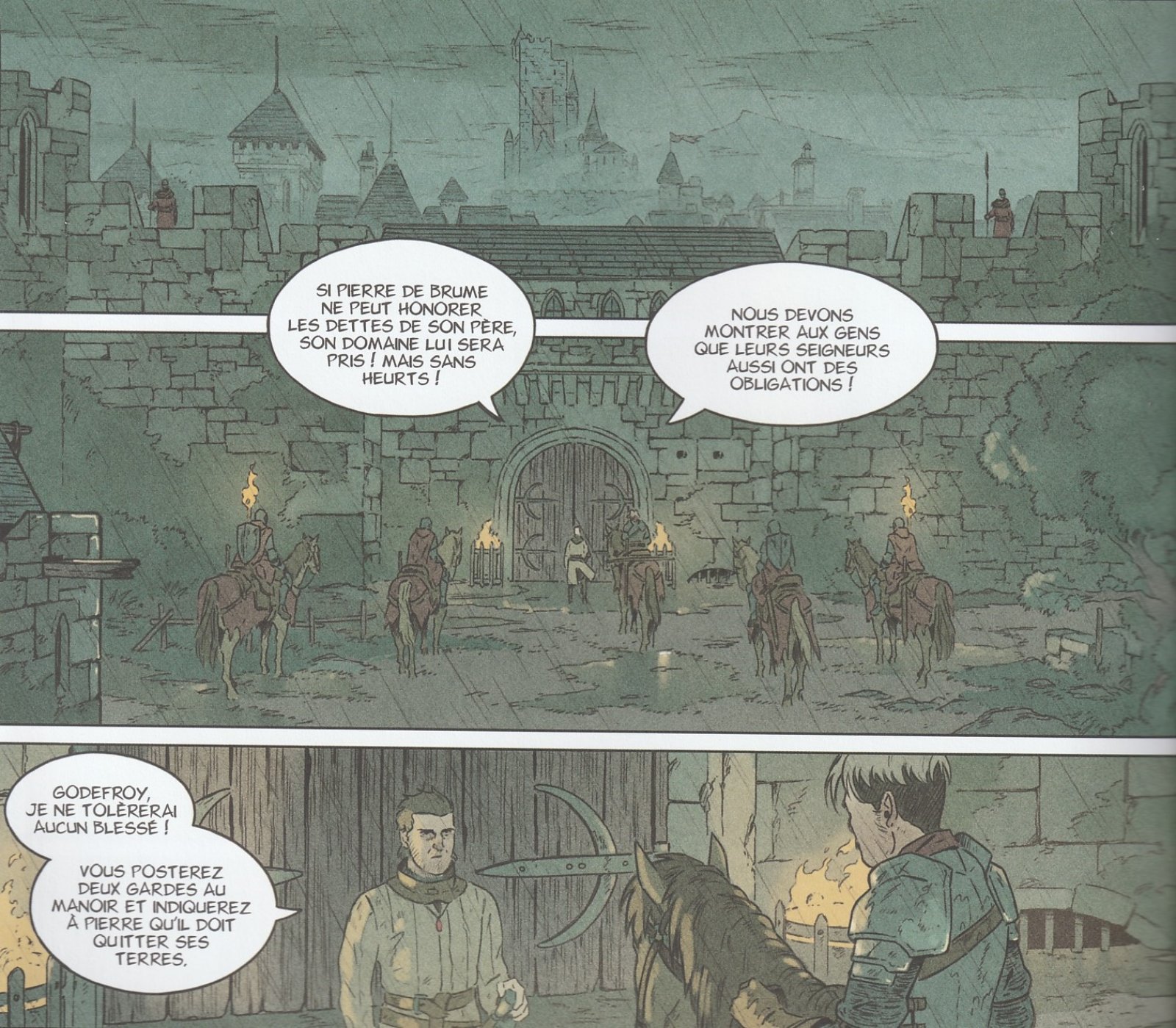 Pour son nouvel ouvrage, Sylvain Ferret nous plonge dans un univers médiéval fait de réalité et de stéréotypes. Val de brume, Griserive ou Havre Obscur sont autant de noms qui marquent l’obscurité de cette période, éclipsée par la Renaissance future. Il faut pourtant bien l’admettre, ce fut une période très inégalitaire où la violence était bien présente. C’est d’ailleurs pour canaliser cette hargne que les croisades furent mises en place. Mais, dans cette époque troublée, comme dans toutes les époques, le manichéisme n’avait pas sa place. Seule comptait la raison d’État qui, souvent, rimait avec la raison du plus fort ! C’est dans ce cadre que le lecteur fait la rencontre de Pierre de Gris. Mal-en-point, il est soigné par de mystérieuses mains couturières et il faut bien quelques pages pour comprendre qu’en réalité il est ramené d’entre les morts. D’une façon générale, l’exposition est assez lente à s’installer. Utilisant très abondamment les flashbacks, le scénariste infuse davantage un contexte que des personnages. Ce monde suinte la violence par tous les pores. Cette violence, trois personnages vont la subir : Pierre de Gris, Marion et le bailly Randolph. Si on comprend vite que l’intrigue va tourner autour d’eux, il faut un certain nombre de péripéties pour que leurs relations deviennent claires. C’est une sorte de triangle amoureux qui se met en place. Rien de très original, me direz-vous, sauf que l’époque est à la sorcellerie et on détecte les références au Seigneur des anneaux ou à la Complainte des Landes perdues ici ou là. Parti en croisade, le roi a besoin d’argent et ponctionne jusqu’à la limite ses terres et ses gens. Une bonne âme va donc chercher à protéger les paysans en volant aux riches pour nourrir les pauvres. Et évidemment, là aussi, on aura reconnu la trame de Robin des Bois. À ses références, Sylvain Ferret ajoute la violence omniprésente et les souhaits de liberté. Cela donne une intrigue très diluée qui avance plus grâce aux flash-backs qu’au péripéties. Une intrigue presque secondaire car la violence, et surtout la quête pour s’en défaire, est le véritable moteur de cet album. Côté dessin, impossible de ne pas commencer par le travail de colorisation. Là aussi, il faut quelques temps pour comprendre les raisons des cases de couleurs différentes. Bien sûr, on saisit immédiatement qu’il s’agit de flashbacks mais leur nombre déstabilise quelque peu. Enfin lorsqu’on se trouve au sein de la narration, ce qui frappe, c’est la tristesse des décors et des personnages. Point de ciel bleu, point de fleur, seul la peine et la grisaille sont présentes et cela conforte cette atmosphère pesante de violences héréditaires. Pourtant, les personnages aux traits réalistes sont ultra charismatiques. A défaut d’être charmants, ils font ce qu’on leur demande : ni bon ni mauvais et les deux à la fois.