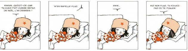 Le format comic strip de l’album, proposé dans un fourreau, convient à merveille pour ces histoires de quatre cases. Le décor y est minimaliste, et Mimosa est le plus souvent seule en scène, plus rarement accompagnée d’un ou d’une camarde de classe, sans oublier les apparitions de Jean-Louis. Les parents sont laissés en hors-champ, ce qui n’est pas gênant puisque cette bd est pensée à hauteur d’enfant et qu’il est beaucoup plus amusant de s’imaginer les parents de Mimosa en fonction de leurs interactions avec elle plutôt que de les voir en chair et en os. Edith, qui sait rendre Mimosa attachante et expressive, a trouvé un truc pour éviter toute lassitude dans le fait de dessiner le même personnage dans toutes les cases : l’impressionnante collection de couvre-chefs qu’arbore la petite fille at qui rajoute toujours une touche de fantaisie, voire de poésie.