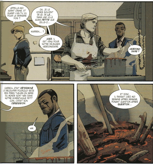 Nailbiter apporte indéniablement un ton, une approche et une ambiance originale et même à certains égards fascinants. Elle mêle le thriller, l’action, le mystère, et l’horreur tout en flirtant avec le surnaturel (on ne peut s’empêcher de penser que la raison de la naissance d’autant de tueurs en série au même endroit ne peut pas être entièrement rationnelle). Les personnages principaux, l’agent Finch et la shérif Crane, sont bien développé et leur duo est un des moteurs de la série mais la véritable star est bien sûr le fantasque Edward Warren aussi fascinant que repoussant. Le dessin est plaisant, il sait faire preuve de personnalité et instiller une ambiance horrifique sans tomber dans le gore gratuit.