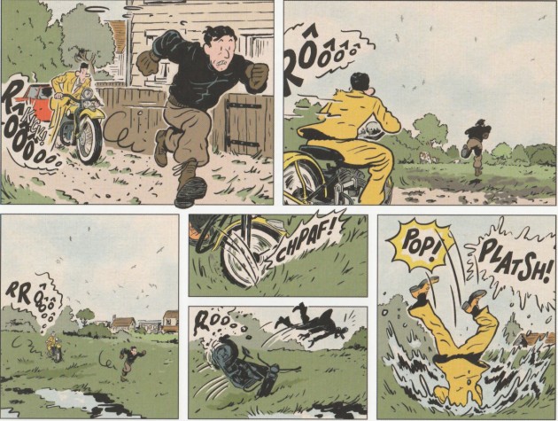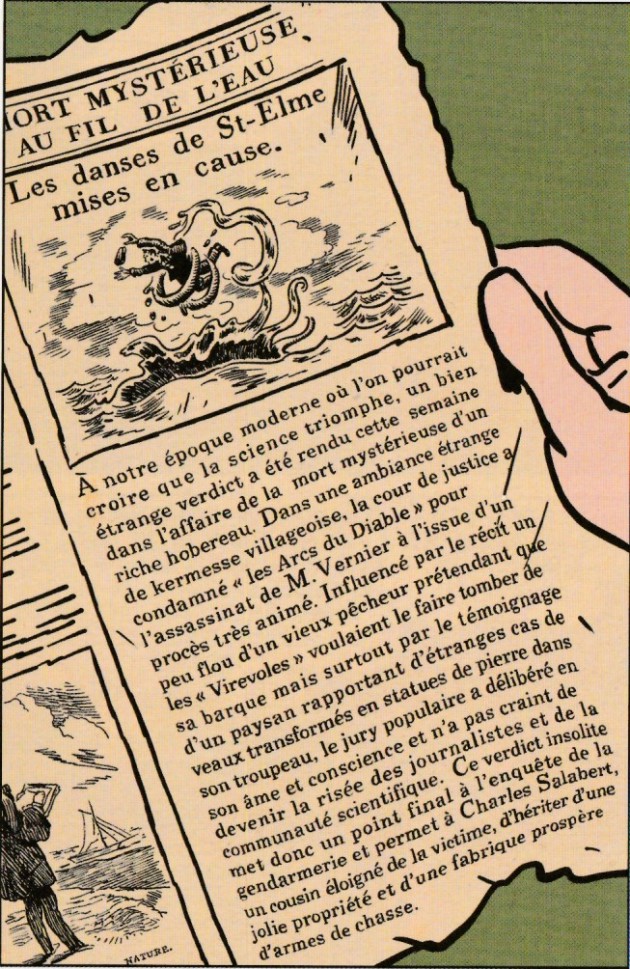 Depuis qu’il a photographié les célèbres danses de Saint Elme, le boxeur et amoureux de Julienne est dans la tourmente. Mais ces étranges phénomènes ont également permis à Pierre Gabus de distiller le doute entre les agents du contre-espionnage, les jumeaux Glacère. Pour rafraîchir la mémoire du lecteur, le scénariste propose un résumé aussi précis qu'efficace en première page. Par la suite, il confère une double page à chaque sous intrigue. Il n'en oublie pas pourtant de brouiller les pistes en ajoutant un nouveau et mystérieux personnage dans un cadre magnifique, les termes du Quai du sud. Sans qu’on s’en rende compte, on suit le déroulement des péripéties les unes après les autres. Sans qu’on s’en rende compte, le rythme alterne entre courses-poursuites, bagarres et filatures d’un côté et exposés scientifiques et émissions d’hypothèses de l’autre. Cette simplicité, cette fluidité ne sont pourtant qu’apparence car, en réalité, les intrigues sont bien plus complexes et imbriquées qu’elles n’en ont l’air. Mais tout finit par s’éclairer comme lorsque le soleil se lève sur le port de Cherbourg. L’autre force de cette série atypique, c’est le dessin de Romuald Reutimann. Loin de tomber dans le cliché de la simple copie, cette ligne claire a tout pour plaire. Les actions se déroulant dans les années 30, ce choix permet à la forme d’être totalement en adéquation avec le fond. La représentation des personnages et leur identification sont d’une rare efficacité. Même les créatures marines, les Grondins, sont crédibles, somptueux mélange d’hippocampe et d’être humain. Il ne faudrait pas oublier que cette série a vu le jour dans la presse