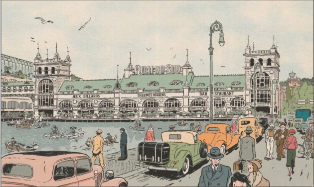 régionale et que New Cherbourg est « une version imaginaire de la ville de Cherbourg en Cotentin ». C’est donc tout naturellement que la cité est représentée. Dans ce cas-là, c’est indéniablement les quai du Sud, transformés en thermes luxueux, qui tiennent le haut de l’affiche, autant en extérieur qu’en intérieur. Et pourtant, personnellement, j’ai plutôt un petit faible pour les véhicules : voitures, motos et même camions me rappellent combien cette époque était riche d’inventivité, de créativité et d’élégance. Pour ne rien gâcher, la colorisation se met au diapason avec des teintes délavées, presque fades qui pourrait bien avoir un siècle.