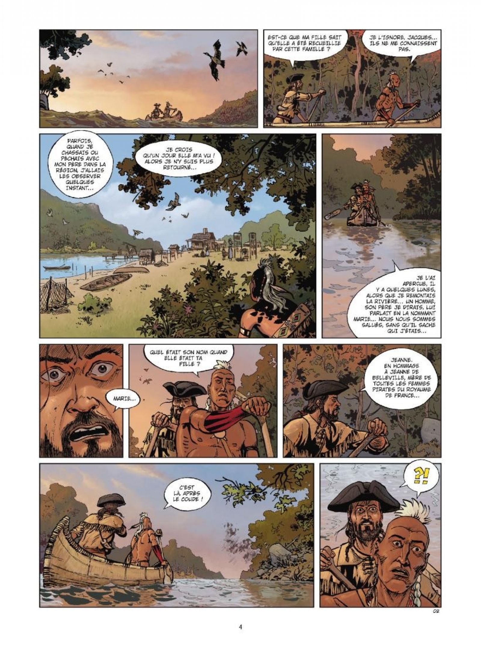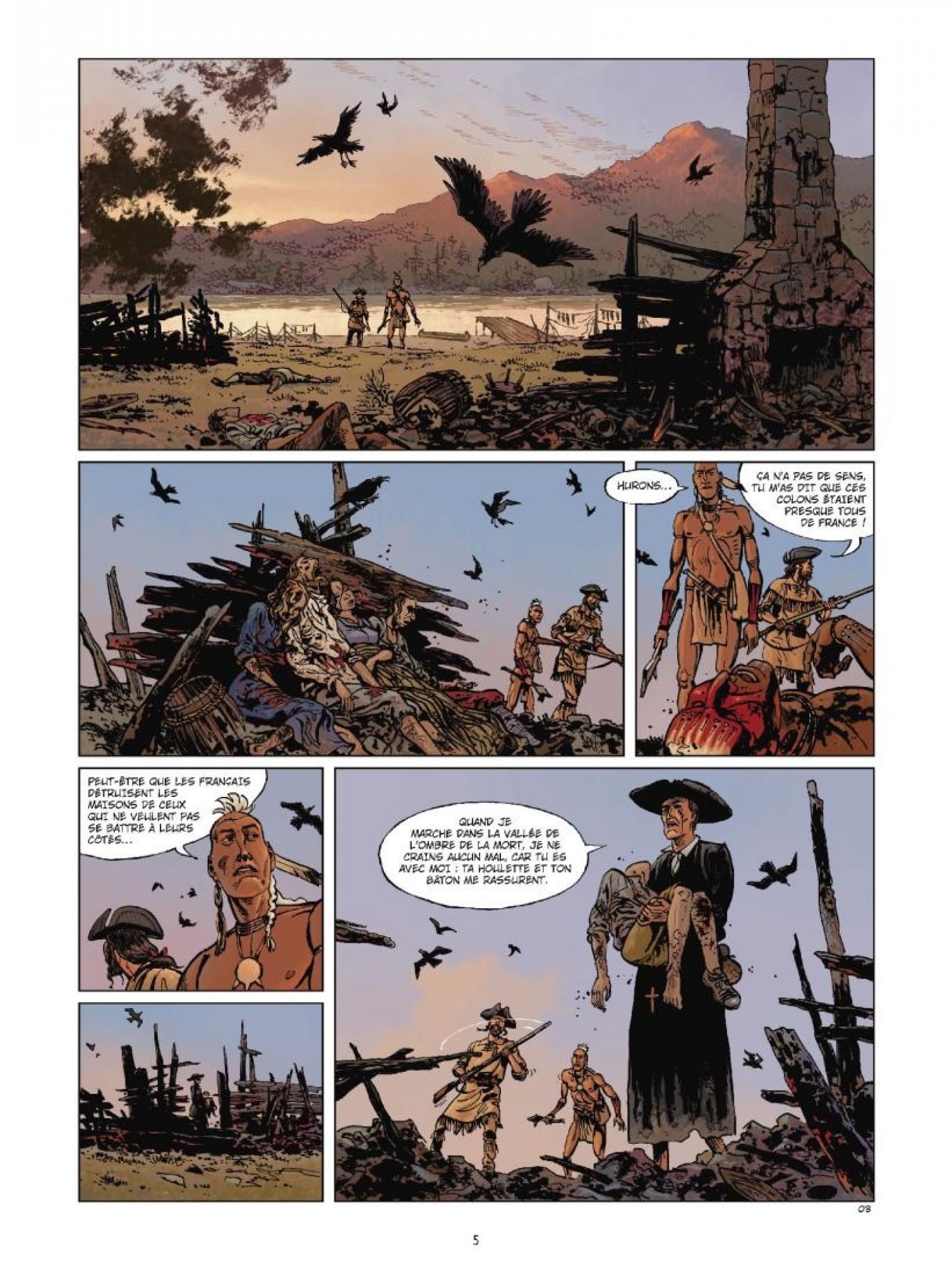 Deuxième volet sur les bords de la rivière Ohio. Dès les premières planches, le rythme de lecture s’installe pour plonger les lecteurs au cœur de l’aventure ou plutôt du conflit qui oppose les Anglais et les Français pour la conquête de la rivière. Fred Duval le scénariste réussit intelligemment à mélanger plusieurs fils rouges à travers son récit. Tout d’abord la vision historique avec les combats, les divergences politiques entre Anglais et Français. Puis les conflits entre les peuples indiens, les Hurons, les Iroquois/Sénécas, Algonquins, même si tout n’est pas simple à comprendre, quelques recherches extérieures permettent d’assouvir sa culture personnelle. Et enfin, l’histoire dans l’Histoire avec d’un côté le couple Loutre-Loup Blanc qui refuse de s’engager dans la guerre et Jacques, le pirate français qui est à la recherche de sa fille. Toutes ces histoires mélangées pourraient donner un imbroglio sans nom mais il n’en est rien, la lecture est plutôt fluide et compréhensible, le tout agrémenté de scènes de combat assez violentes.