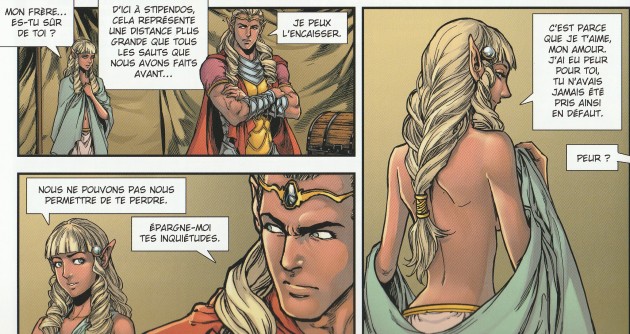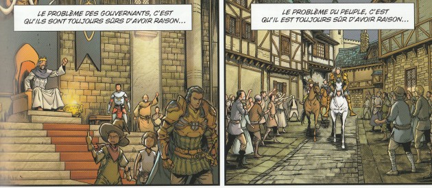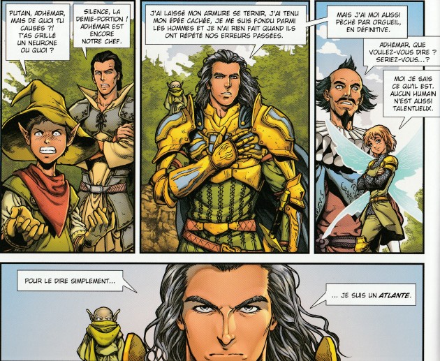 horde de héros pour le moins disparate en pleine crise après le décès de Bérard. C’est le moment que choisit le scénariste pour nous livrer quelques renseignements et pour son héros Adhémar pour faire quelques confidences. Pour faire simple, il est un des derniers atlantes ! Surtout, il est bien décidé à ne pas laisser les Hommes commettre les mêmes erreurs que ses congénères ! Débute alors un voyage qui va mener la troupe jusqu’à la capitale. Voyage rythmé par de nombreuses escarmouches, des accueils chaleureux et de froides délégations. Cette partie, traitée majoritairement sous forme d’ellipses, est assez agréable et fluide. Puis viennent la rencontre avec le roi et la bataille finale. C’est là que tout s’emballe et on a un peu le sentiment que cet épilogue est légèrement bâclé. On se demande s’il n'y a pas eu de sacrés coupes franches pour que tout rentre en deux tomes. C’est un peu déstabilisant même si cela reste parfaitement fluide et plutôt agréable à lire. Il est fort probable que les très nombreux emprunts à l’univers de Tolkien et aux adaptation de Peter Jackson y soient pour quelque chose.