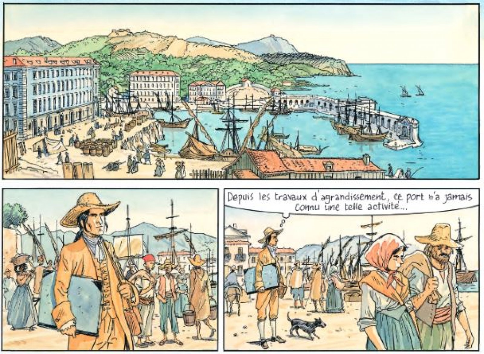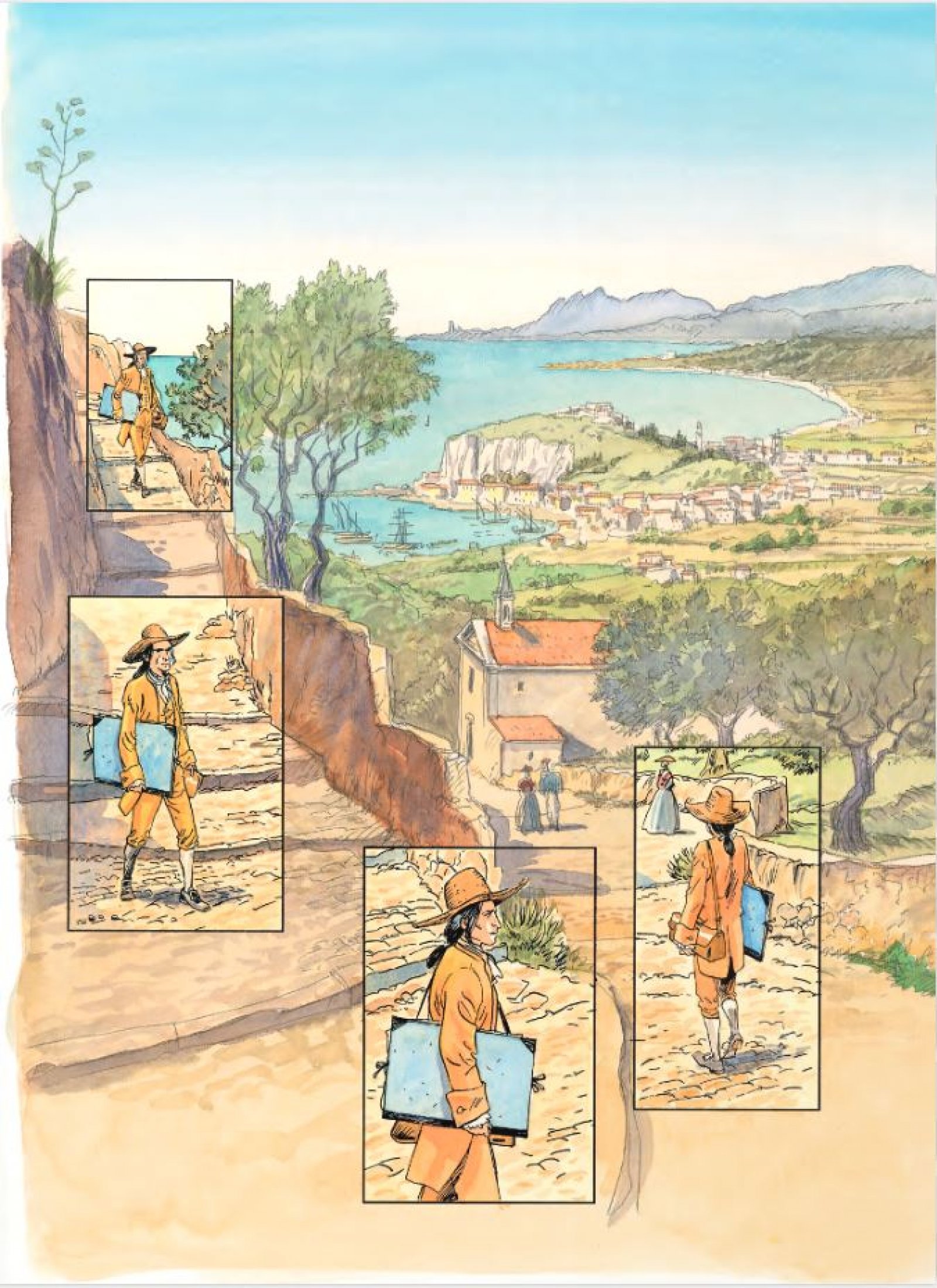 Mais ce qui m’a le plus marqué, ce sont les dessins, sans conteste le point fort de l’album. Ferrandez, fidèle à son style, utilise l’aquarelle pour donner vie aux paysages et aux visages de cette aventure méditerranéenne. Chaque planche est une invitation au voyage : les ruelles de Nice, les ports de Malte, les déserts égyptiens, et les pyramides se déploient sous nos yeux avec une incroyable. Les couleurs douces et lumineuses renforcent cette sensation d’immersion.
