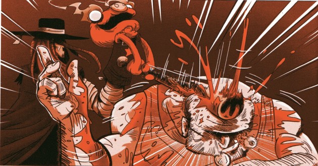 Overkiller, car on a là un melting pot d’influences et de références qui tend parfois vers le n’importe quoi pour mieux nous surprendre et nous amuser. La mafia française en est un bon exemple, sa seule existence prête à sourire tant on est plutôt habitué à voir des mafias italiennes ou des pays de l’est, mais les auteurs y vont à fond dans le cliché avec un mime tueur, et poussent encore le bouchon en lui conférant des pouvoirs certes originaux et amusants mais aussi complètement cheatés. Bref, c’est n’imp mais c’est fun. On pourrait aussi parler des cadres hauts en couleurs de la chaîne de télé marxiste… La violence est tellement exagérée qu’elle en devient cartoonesque, tandis que les situations et les personnages improbables s’enchaînent à un tel rythme qu’on se fait du souci pour la santé mentale des auteurs.