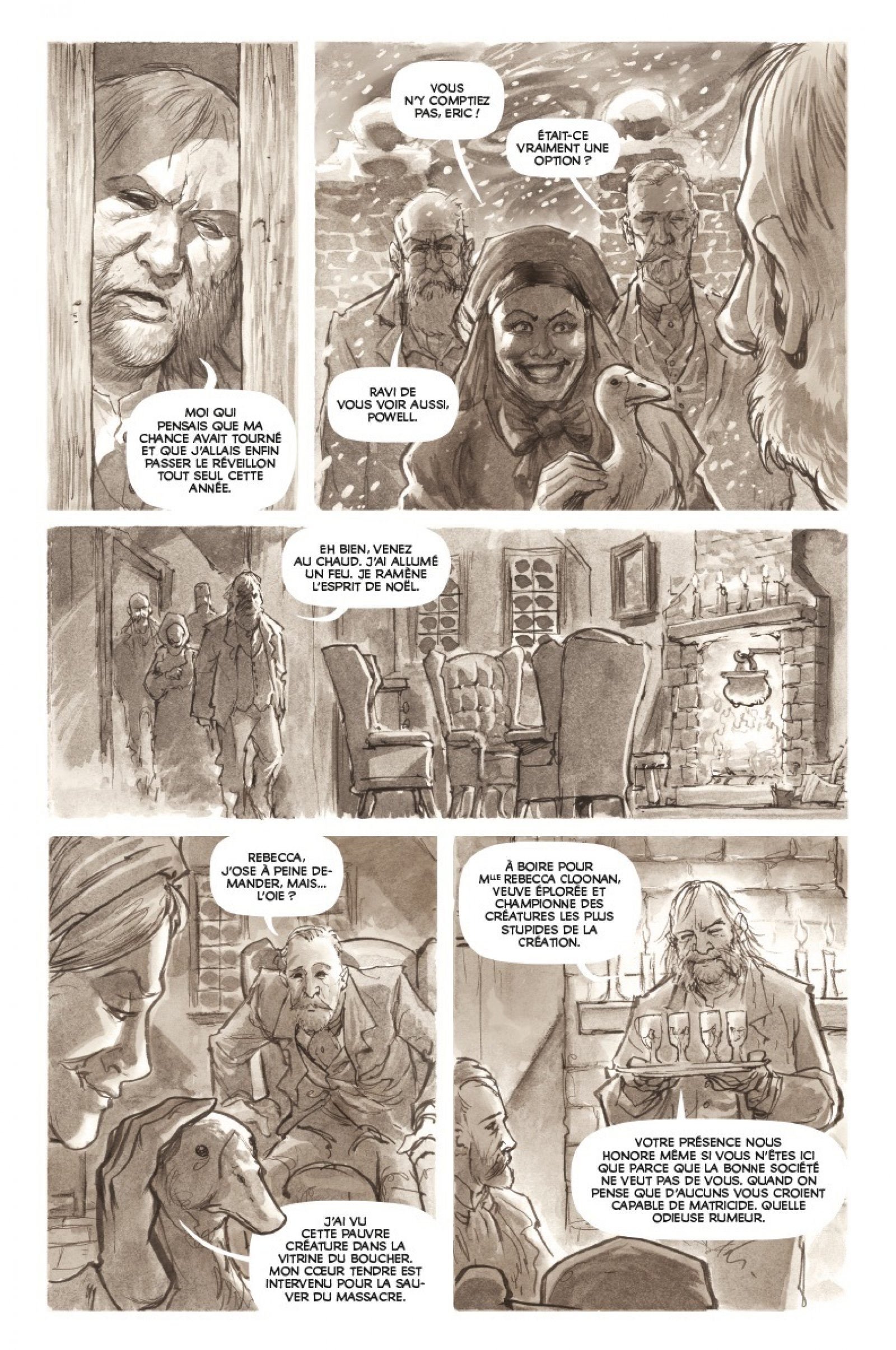 Il neige sur Londres la nuit du réveillon de Noël en 1843. Devant une bâtisse quelque peu mal entretenue, deux hommes et une femme se dirigent vers la porte d’entrée. Le lourd bruit du heurtoir fait déplacer le maître des lieux, un certain Powell. Avec une joie dissimulée, Eric Powell fait entrer ses amis, Rebecca Cloonan, James Harren et Michael Mignola et les invite à prendre un verre. L’ambiance s’installe mais chaque protagoniste semble bien mystérieux et les petites remarques fusent entre eux. Powell lance alors la grande tradition de Noël qui consiste à raconter une histoire de fantôme tragique et terrifiante.