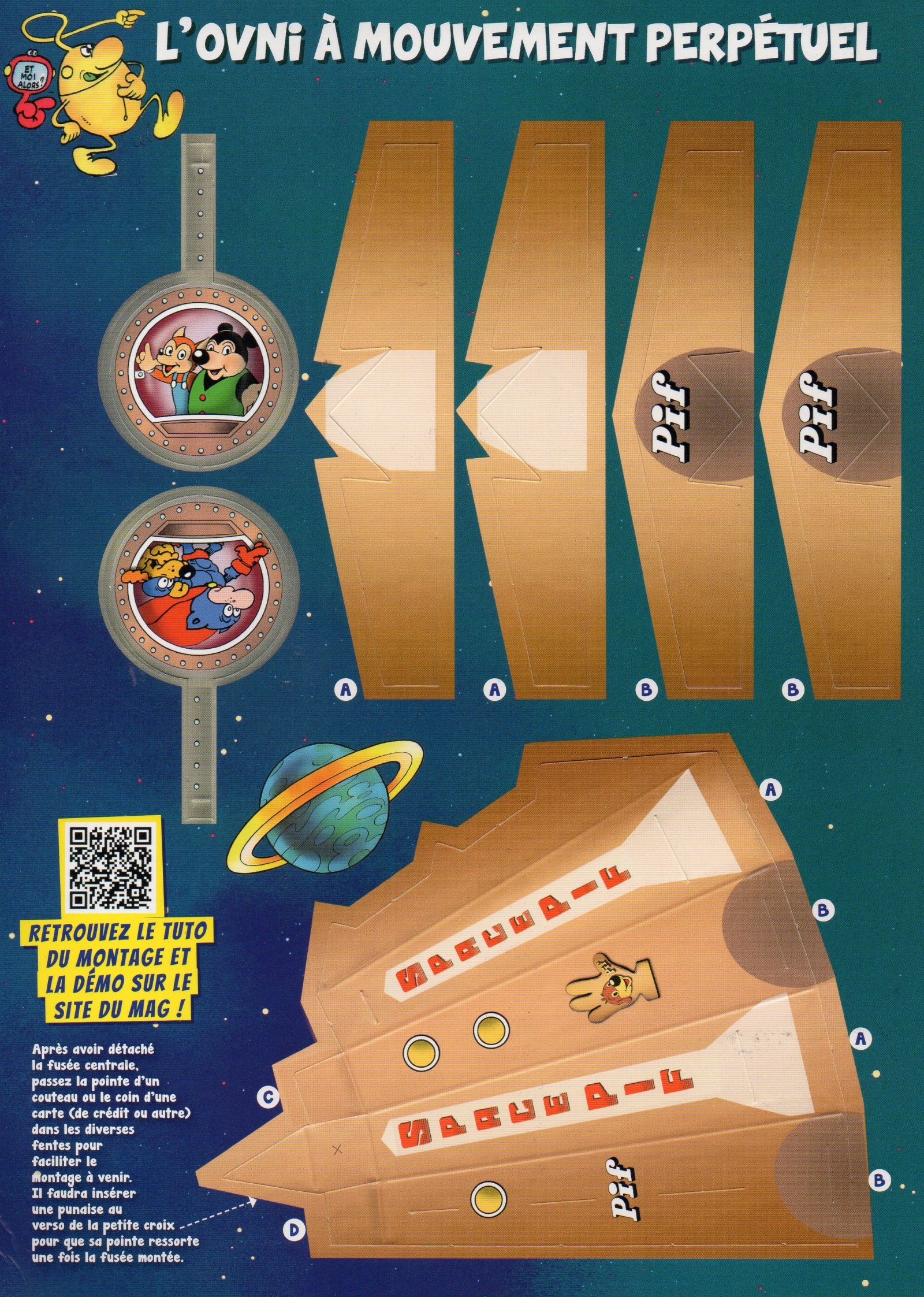 Le gadget de ce numéro, un OVNI à mouvement perpétuel, s’inscrit pleinement dans cette tradition mêlant science et ludisme. Il rappelle que Pif Gadget n’a jamais été uniquement un magazine de BD, mais aussi un outil de vulgarisation, où l’expérimentation et la curiosité occupent une place centrale.