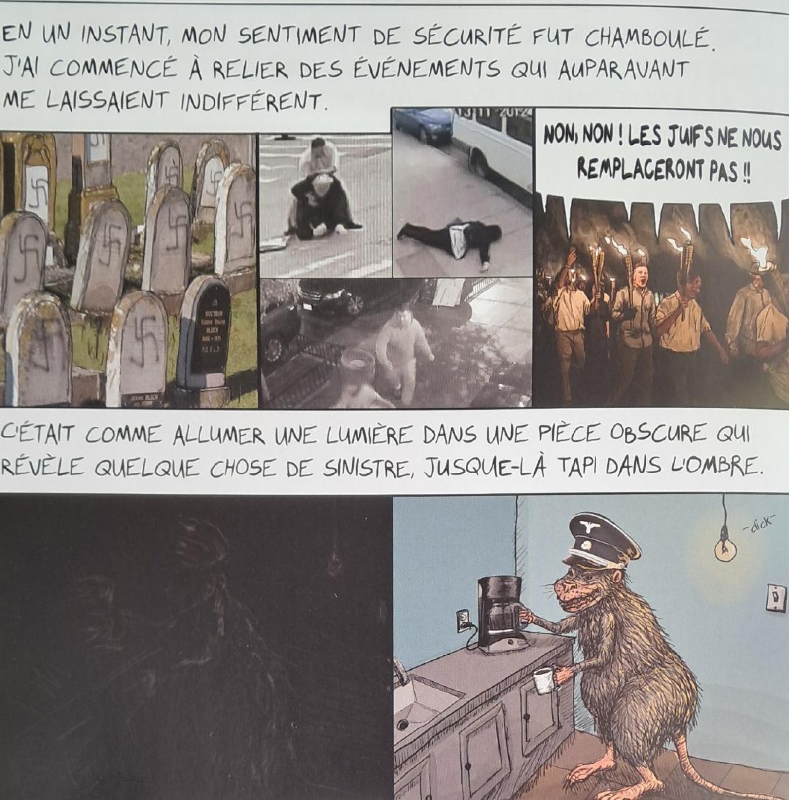 Ari RICHTER raconte sa prise de conscience du traumatisme qu’a affronté sa famille. Lui qui a grandi aux ÉTATS-UNIS avait pourtant l’impression d’être totalement assimilé alors qu’il dissimulait en réalité son désir d’oublier son ascendance juive quitte à négliger les insultes antisémites qu’il dut parfois affronter. Ce n’est qu’adulte qu’il assumera totalement sa judéité, et comprendra que la bête infâme n’est pas morte en regroupant des agressions subies par les Juif·ve·s dans son pays. Il sombrera alors dans une dépression en comprenant qu’il s’était dédoublé et oublié ce faisant.