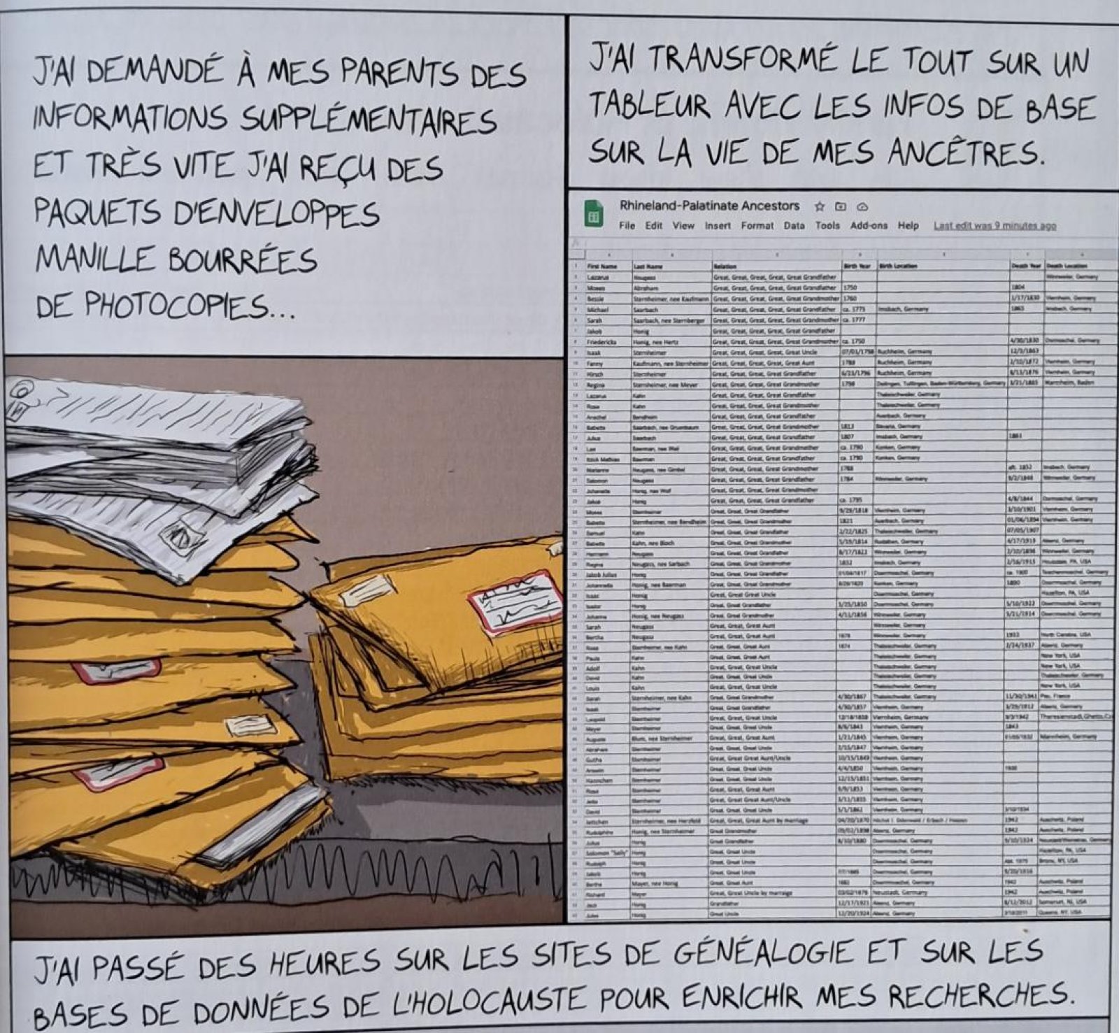 Ari RICHTER fait preuve d’ironie, marque de sa lucidité désarmante face au traumatisme collectif engendré par les autoritarismes. Il en appelle ainsi à notre réflexion en évoquant la rhétorique populiste commune à l’ALLEMAGNE des années 30 et l’AMÉRIQUE trumpiste. Cette « banalisation du mal » évoquée par Hannah ARENDT se retrouve dans l’alliance que le bédéaste livre de son quotidien aux prises avec les souvenirs familiaux qui le submergent à la faveur des archives qu’il compile. On trouve d’ailleurs sur les planches au fond noir des photographies qui côtoient des tableaux de données.