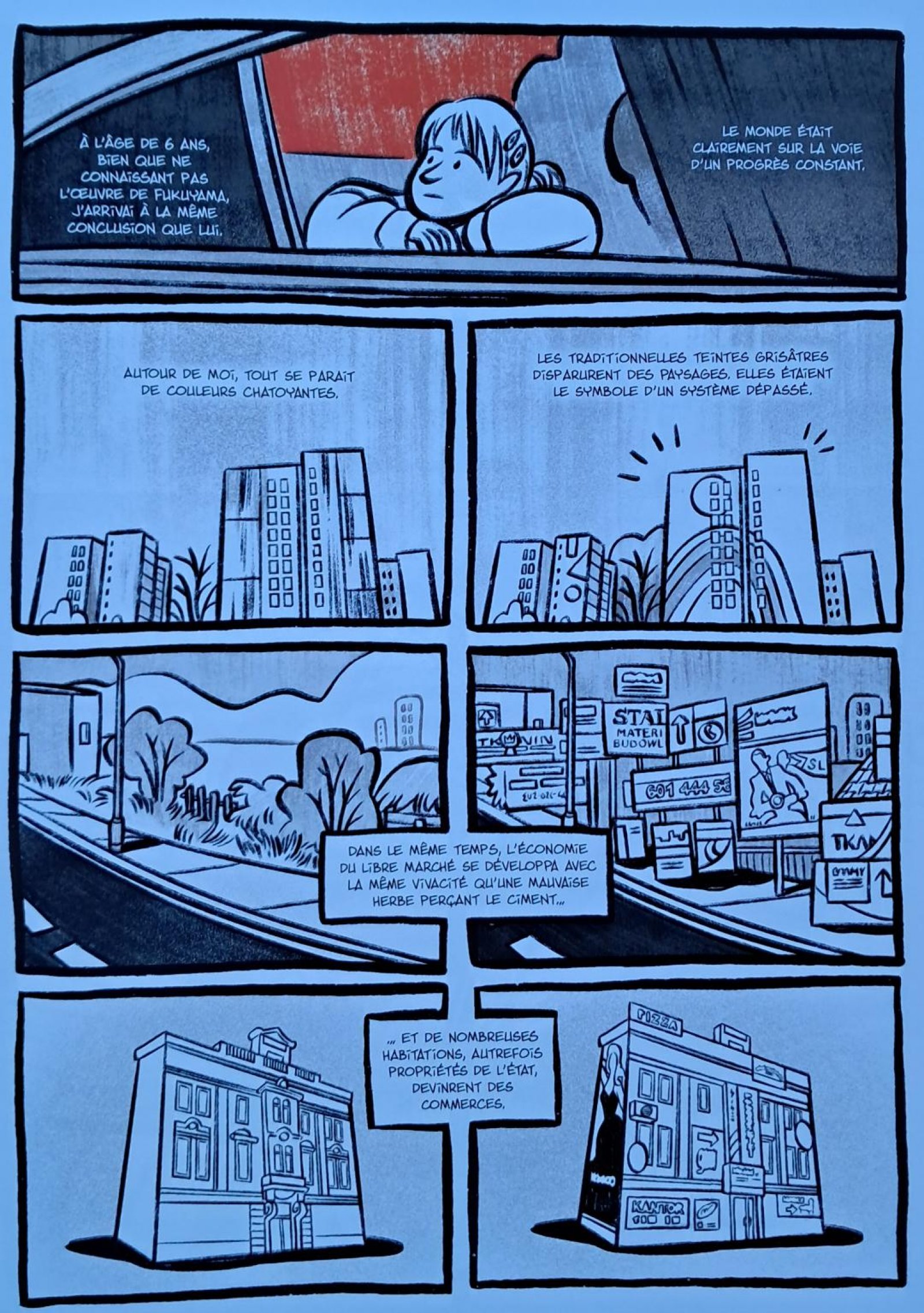 Avec beaucoup de lucidité et d’ironie, Kasia BABAIS parcourt au fil de cinq chapitres sa vie de son enfance à l’âge adulte en la mettant en perspective avec l’histoire de la POLOGNE. Celle-ci apparaît effectivement aussi divisée que l’est la génération de l’artiste avec celle de ses parents en raison d’une Histoire perturbée. Ainsi, après avoir disparu pendant plus d’un siècle, le pays est né à nouveau au XXe siècle, mais scindé en une POLOGNE à la frontière de l’ALLEMAGNE, appelée POLOGNE A, économiquement plus développée que la POLOGNE B sous influence russe. Les parents de Kasia en sont révélateurs puisque sa mère est originaire de la POLOGNE B tandis que son père a moins souffert des pénuries en ayant grandi dans la POLOGNE A.