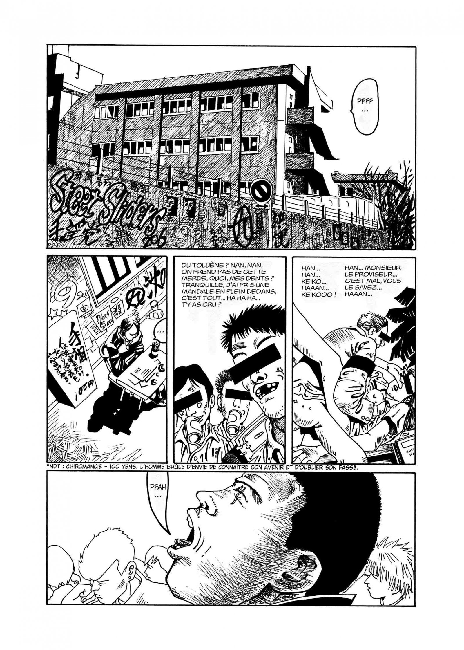 un trait libre, presque sale, des corps parfois déformés, des visages expressifs à l’excès. Ce style peut dérouter, surtout si l’on vient d’un manga plus académique, mais il sert parfaitement le propos.