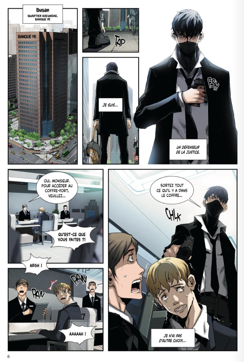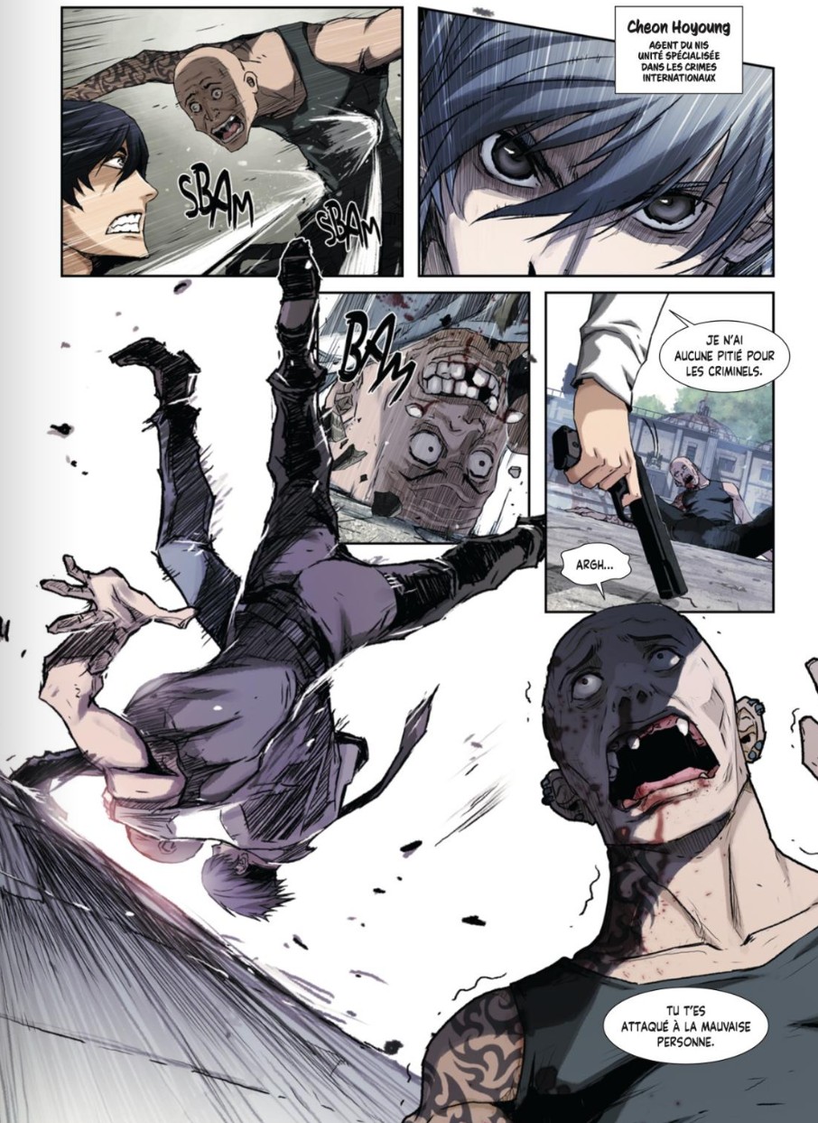 Le défi d'adapter un jeu de tir en bande dessinée réside dans le dynamisme des scènes d'action. Le dessinateur Yoon Yeol CHOI relève le gant avec brio. Son trait, incisif et moderne, parvient à retranscrire l'urgence du combat et la brutalité des échanges. Le découpage, hérité du format Webtoon (lecture verticale optimisée), offre une fluidité cinématographique qui accentue la sensation de mouvement. Les décors désolés de l'île contrastent avec la violence soudaine des affrontements, créant une atmosphère pesante, presque étouffante.