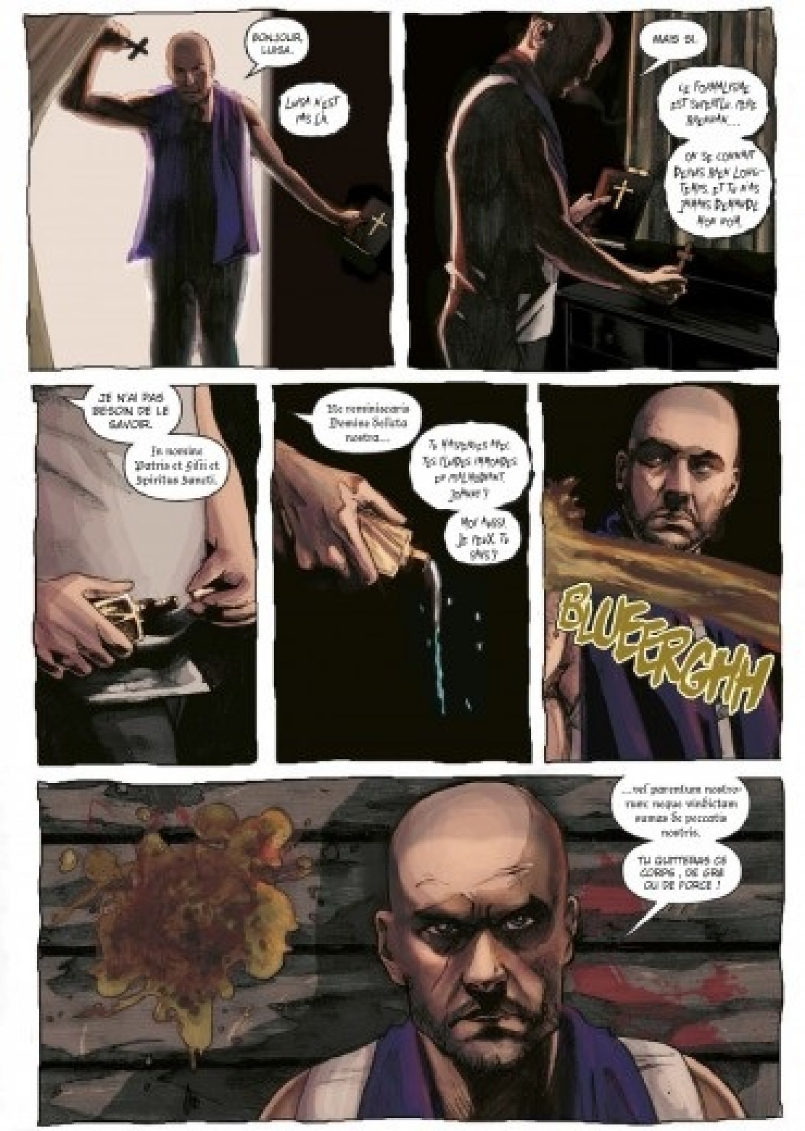 Le dessinateur espagnol Jaime Martinez se base beaucoup sur les gros plans et met surtout en avant ses personnages. On délivrera un coup de cœur au père Brennan, qui ressemble à tout sauf à un prêtre classique, sorte de baroudeur mais il faut au moins cela si l’on veut être le meilleur exorciste. Un petit plus pour les couleurs de Sandra Molina (également espagnole) qui donnent bien le ton et renforcent davantage l’angoisse des planches.