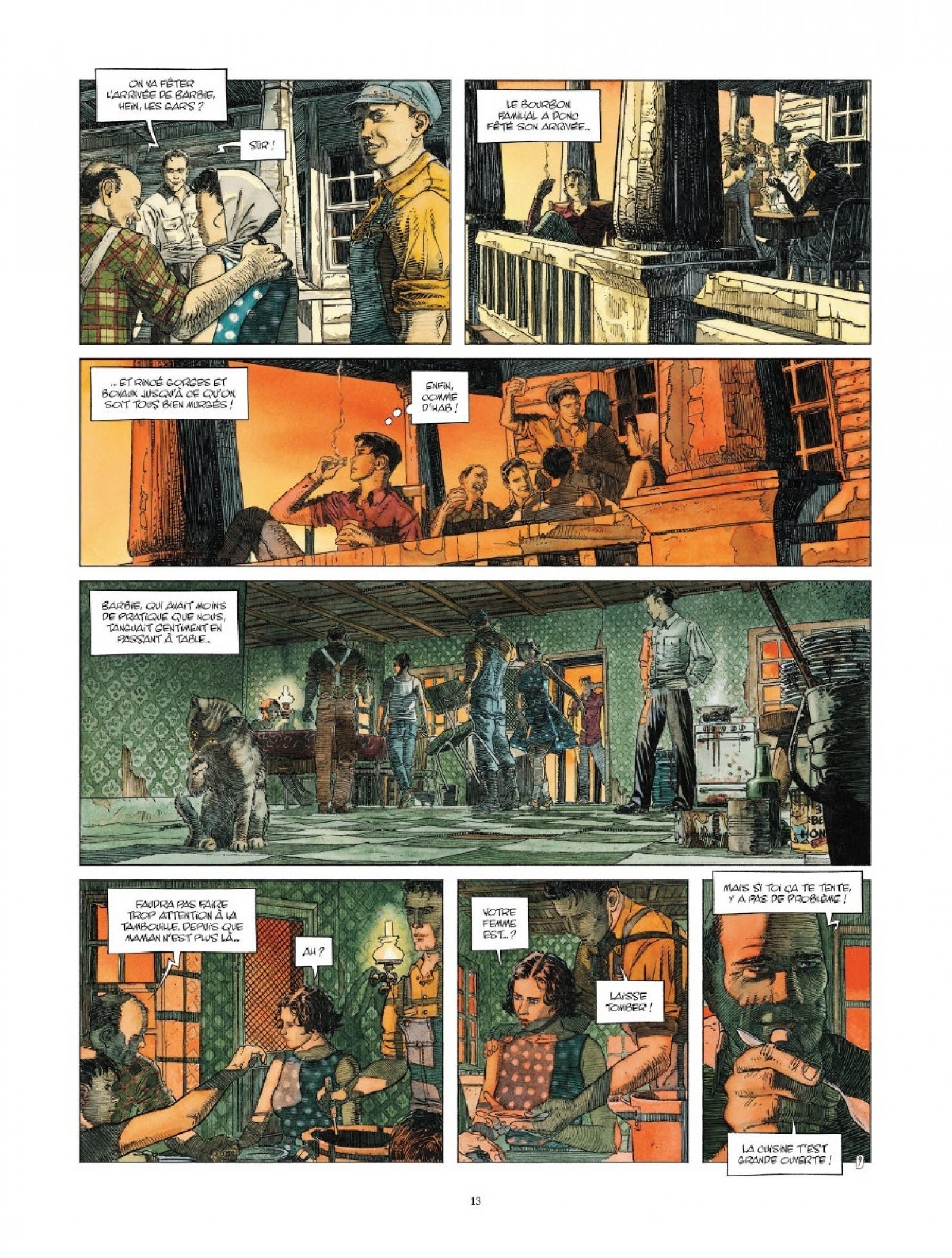 Le scénario est très intéressant : à travers cette famille de sept personnes, Rodolphe parvient en une centaine de pages à raconter l’histoire et le destin de chacun. Certains s’orienteront vers la violence, d’autres vers la résilience, le mutisme ou la folie. Hank, lui, mise tout sur le rockabilly. Une palette riche qui donne du rythme au récit et qui, malgré le nombre de protagonistes, reste fluide, prenante et très agréable à lire.