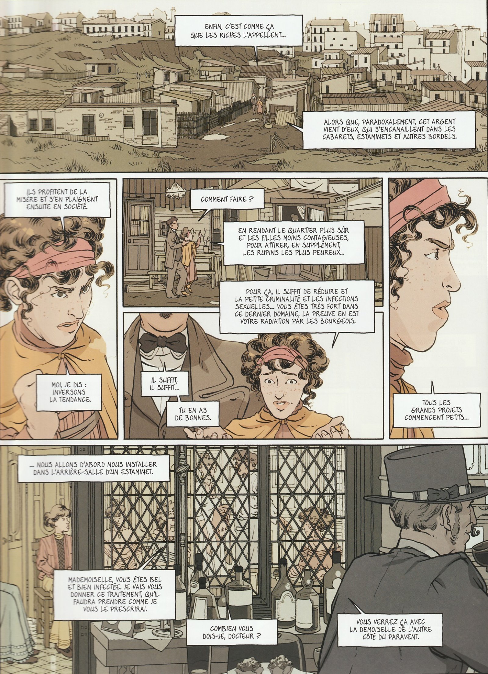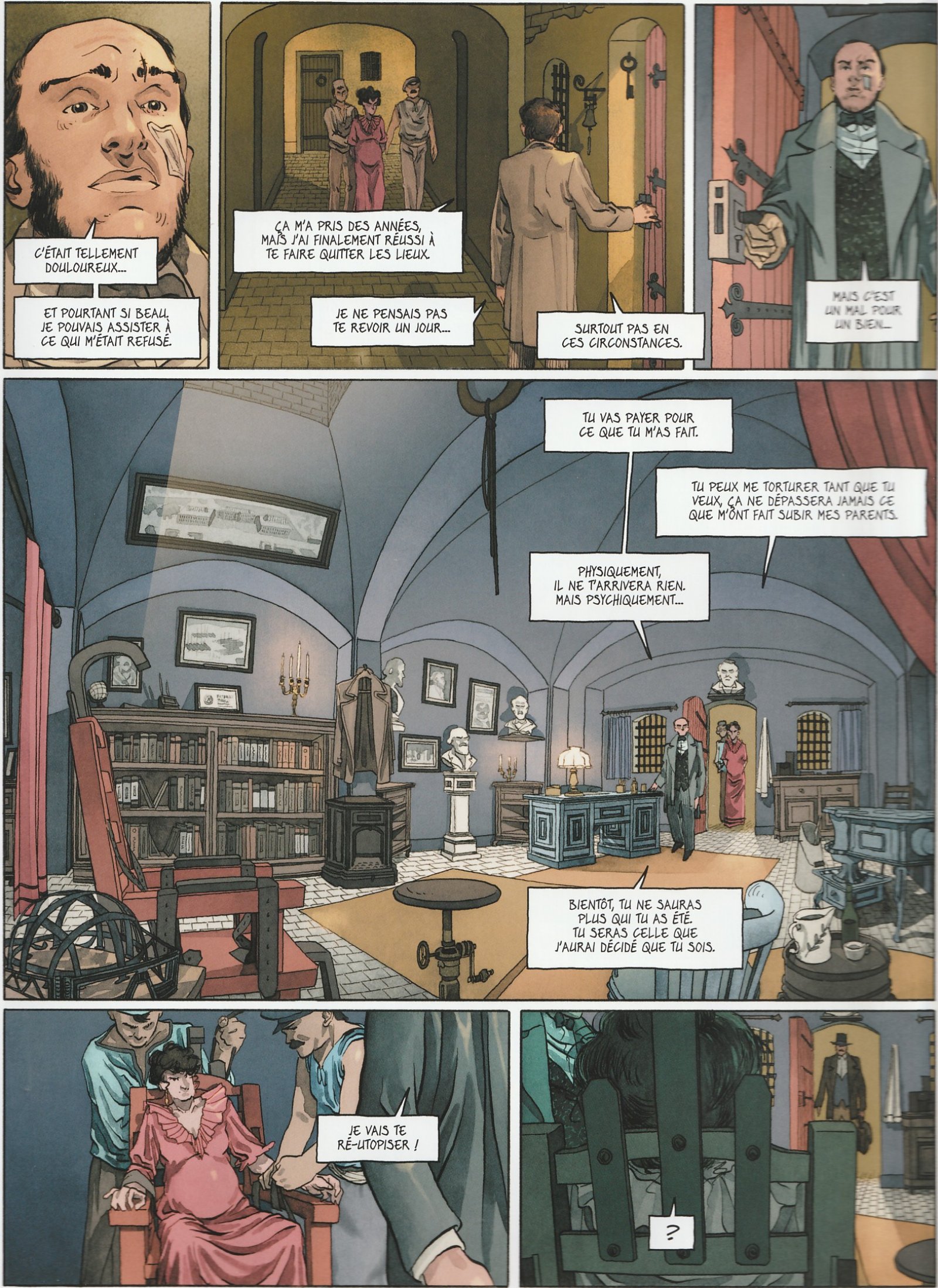 Le format en diptyque convient parfaitement à cette intrigue autour du familistère de Godin. L’album d’ouverture mêlait deux temporalités : d’un côté, la rencontre entre Glannes, jeune délinquante parisienne, et le capitaine d’industrie utopiste ; de l’autre, une décennie plus tard, un Maître Caius au familistère de Guise, en lutte avec celui de Madame Fournier à Paris. On assistait au kidnapping de la gérante avant de comprendre qu’elle ne faisait qu’une avec la jeune Glannes, Caius étant en réalité Émile, le fils de Godin. Dans ce second épisode, Jean-David Morvan comble les zones d’ombre. Le premier flash-back est issu d’une séance de torture infligée à Glannes. Hypnotisée, elle raconte son enfance misérable, digne d’un roman de Victor Hugo. Mais par la suite, elle ne se laissera plus jamais le prédécesseur de Messmer pénétrer son esprit. Le scénariste a alors la bonne idée de confronter tous les protagonistes. Glannes explique pourquoi elle s’est enfuie et comment elle en est venue à transposer l’utopie de Godin à la classe laborieuse parisienne. Ce faisant, elle endort quelque peu ses interlocuteurs… et le réveil final est d’une brutalité saisissante. On assiste ainsi à un rythme très particulier, brillamment maîtrisé par Morvan. C’est toujours Romain Rousseaux-Perrin qui met en images ce récit emboîté. Son trait essentiellement réaliste est efficace, même si certaines expressions frôlent parfois la caricature. Les personnages restent facilement identifiables, quelle que soit l’époque, ce qui s’avère précieux dans ce type de narration. Les décors, d’une grande justesse, méritent également d’être salués, notamment la superbe double page représentant la grande verrière de Guise. Lorsqu’ils relèvent de l’imaginaire de Morvan, ils demeurent néanmoins tout à fait crédibles. Sur une mise en page plutôt classique, le dessinateur propose quelques véritables morceaux de bravoure. La plongée dans les pensées d’Émile Godin rend parfaitement compte de ses tourments. Certains zooms servent à accélérer l’action, tandis que des dialogues en ping-pong occupent des doubles planches et que des inserts jouent habilement le rôle d’ellipses. Malgré un ton parfois très professoral, l’ensemble reste particulièrement agréable à lire. Enfin, la colorisation de Hiroyuki Ooshima facilite la distinction entre le récit-cadre et le récit enchâssé, renforçant ainsi la fluidité de lecture.