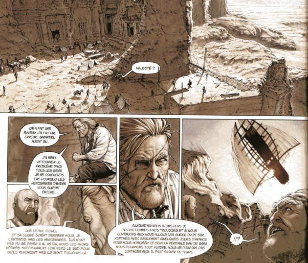 Pour en revenir à ce Livre V, l’histoire réunit tous les principaux protagonistes depuis le début de la série alors que les albums précédents, s’intéressants aux différents peuples, étaient peu ou prou indépendants (il y a des liens et une continuité indéniable mais les enjeux et les personnages pouvaient grandement différés d’une culture à l’autre). Tout doit donc se terminer dans cette forteresse du désert oubliée de tous et les thèmes politiques, sociaux et religieux de la série sont sur le point de trouver leur conclusion.