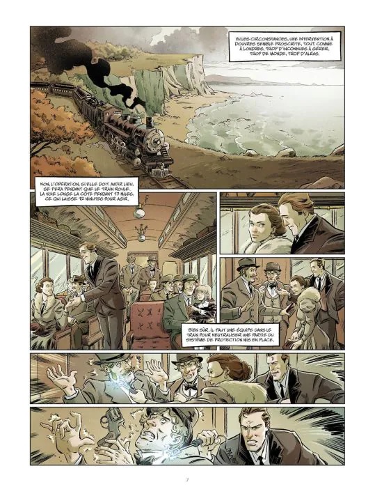 A la campagne, Sherlock Holmes est en train de se détendre sous un arbre en jouant de la flûte traversière lorsque son frère Mycroft vient le rejoindre pour lui demander son aide afin de résoudre ou plutôt d’anticiper une affaire qui s’annonce épineuse. En effet, les héritiers de Moriarty projettent d’attaquer un train entre Londres et Douvres afin de dérober un butin inestimable. Holmes élabore, avec les informations qu’on lui donne et toute son intelligence, un plan imparable pour contrecarrer le futur vol. Pendant ce temps, à Paris à la Bibliothèque de l’Arsenal, un veilleur de nuit surprend un homme qui n’est autre qu’Arsène Lupin en train de fouiller dans une bibliothèque. Aussitôt le veilleur le met en joue mais Lupin ne se laisse pas démonter, il fait croire avec sa complice qu’ils sont des spécialistes de la sécurité et qu’ils participent à une évaluation surprise. Le gardien après avoir été loué pour son professionnalisme est reconduit à la porte de la pièce, abasourdi, et le temps de prévenir la police, Lupin et sa complice dérobent ce dont ils ont besoin. De retour à leur château qui leur sert de retraite, Lupin et sa complice Nelly s’aperçoivent que tous leurs biens ont été volés, il ne reste qu’une carte de visite signée Moriarty.