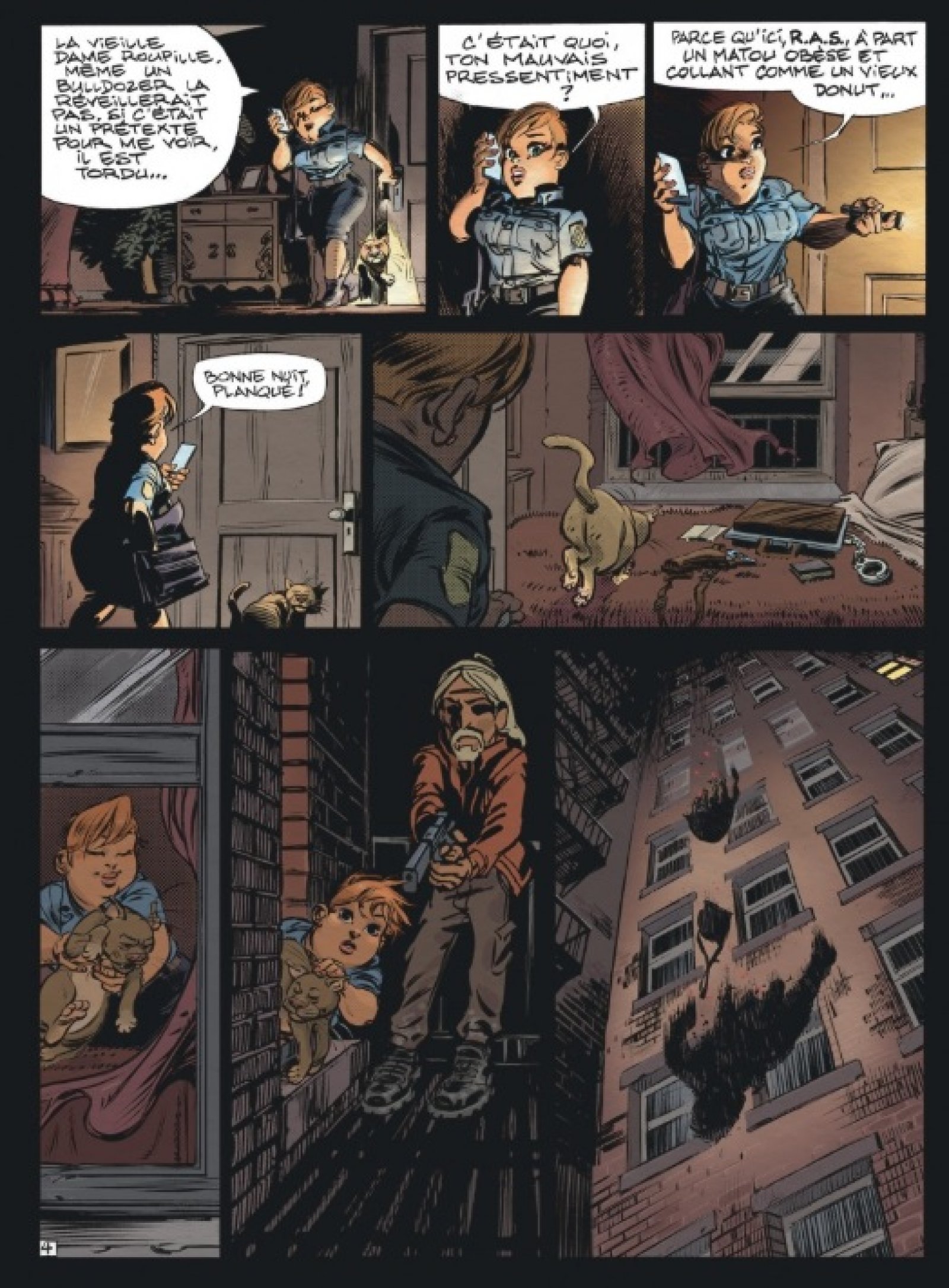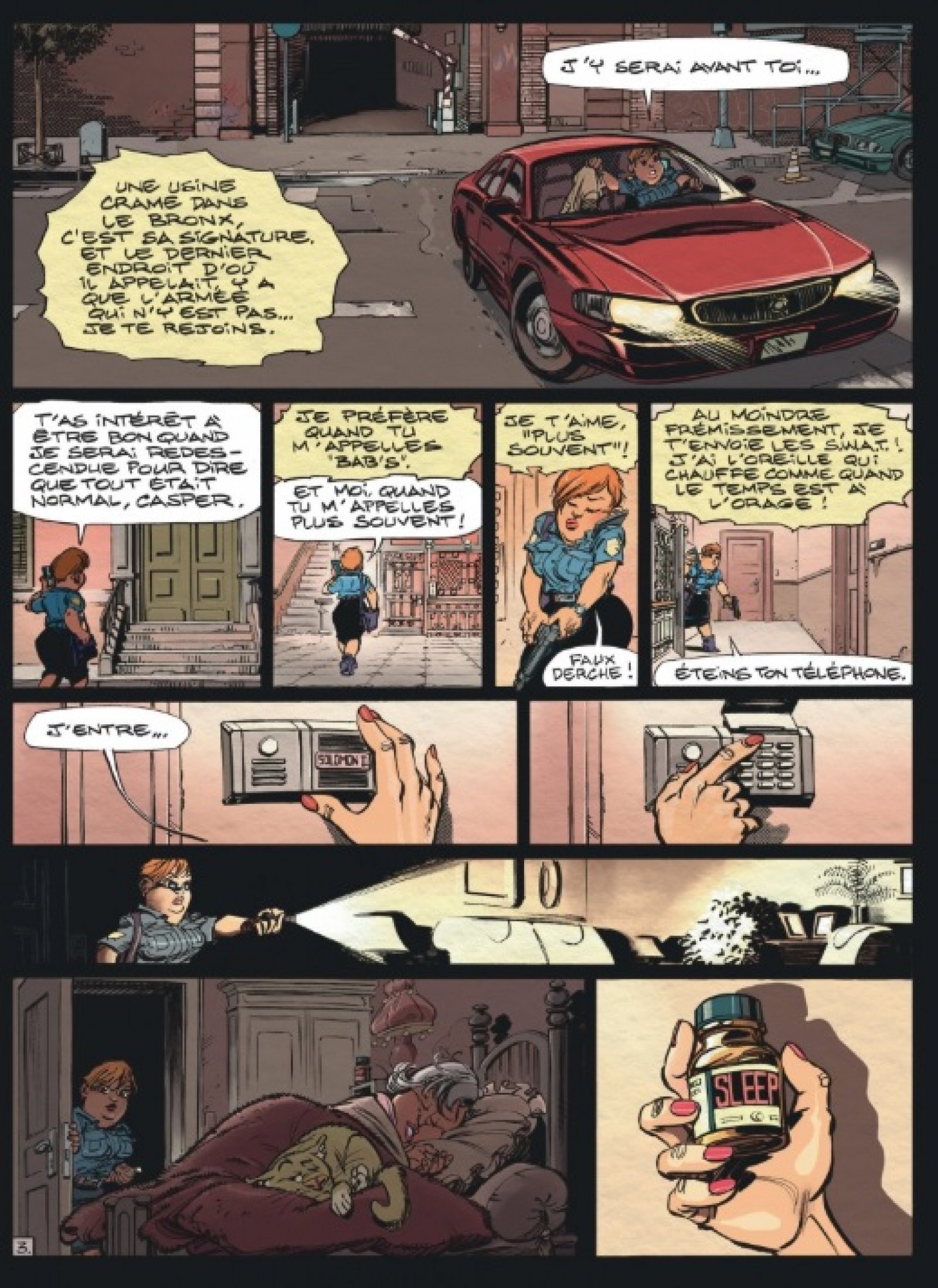 C’est à cette étape que démarre ce dernier volet de Soda où Bab’s prend contact avec son amie Cynthia, flic de son état, pour lui demander d’aller jeter un coup d’œil chez Soda pour voir si Mary ne risque rien pendant que Soda mène son enquête dans les entrepôts désaffectés. Une fois arrivée, tout semble normal, Mary dort à poings fermés, toutes les affaires sont en place, il n’y a qu’une fenêtre qui est curieusement ouverte dans une chambre, donnant sur l’escalier de service. Cynthia aura le malheur de se pencher par la fenêtre, c’est le dernier geste qu’elle fera. Ce meurtre, magouillé en accident, et l’insécurité dans laquelle vit Soda vont l’amener à redoubler de vigilance et à accélérer ses investigations.